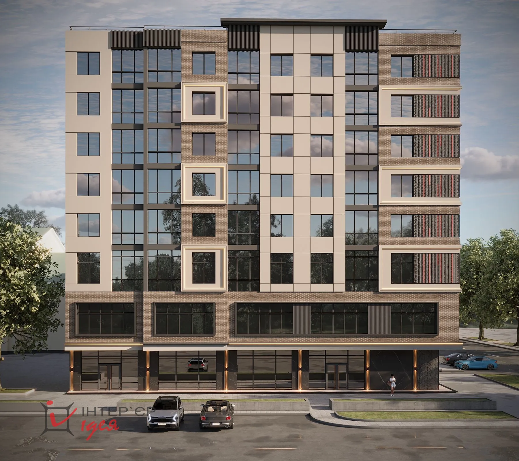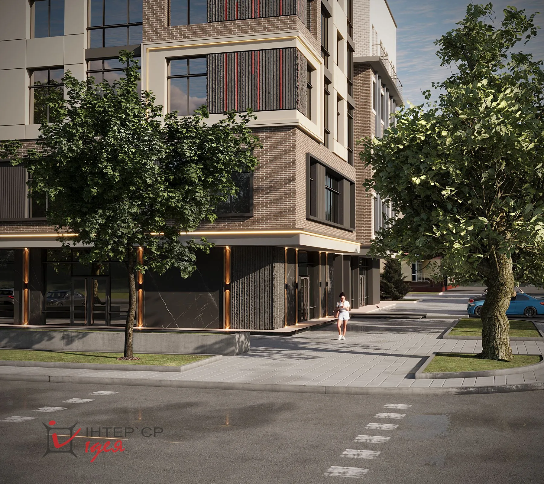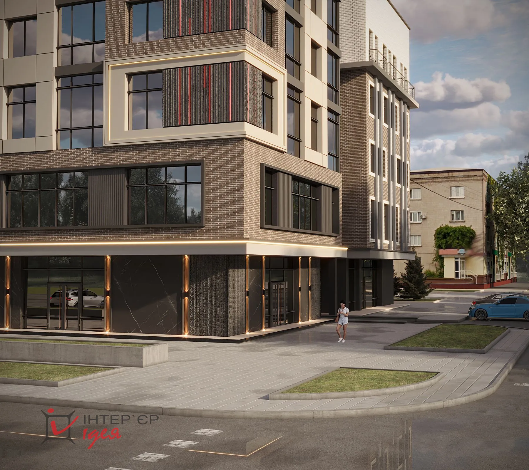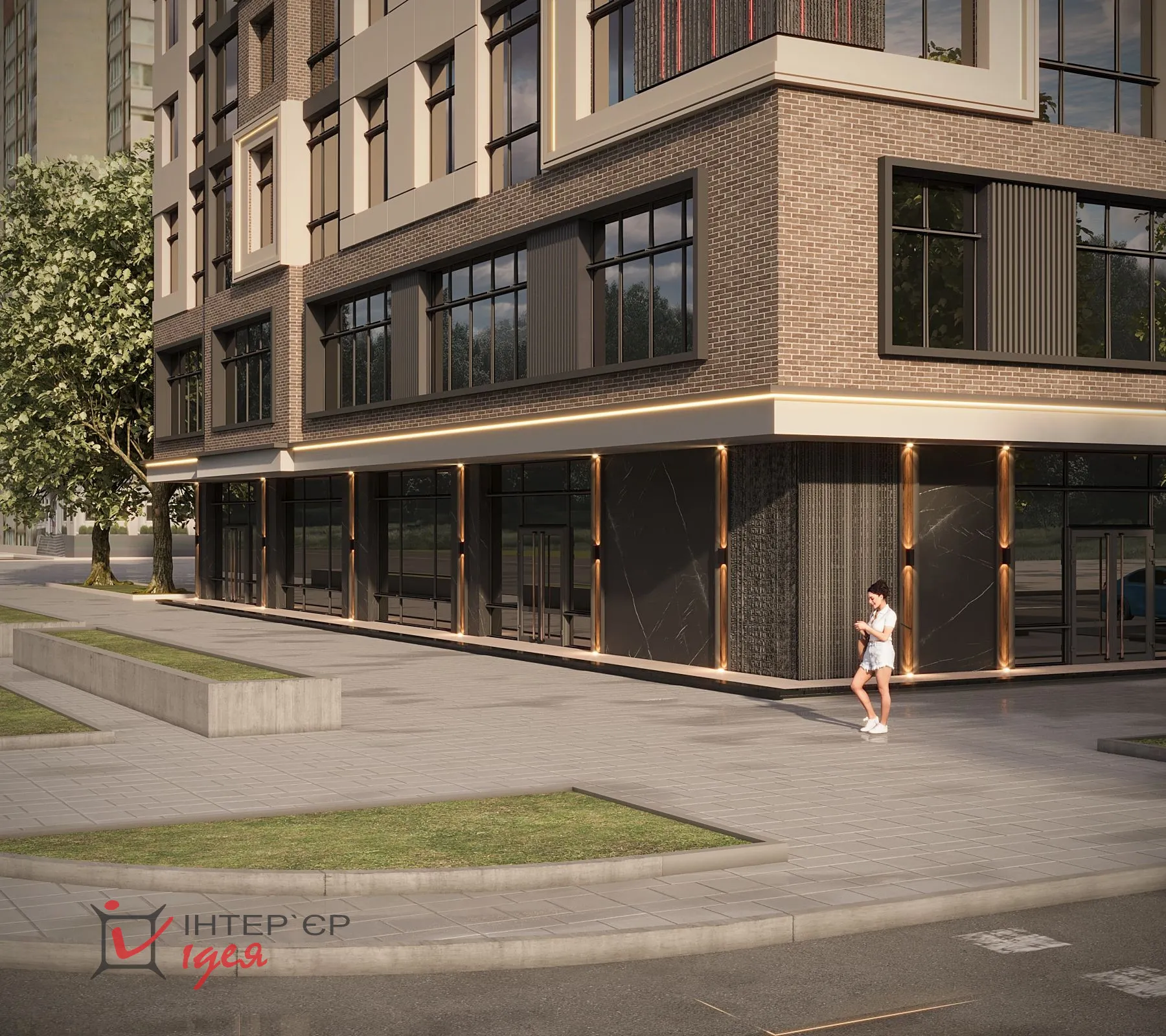 Фрагменти фасадів з високим склінням об'єднані в окремі вертикальні масиви за допомогою обробки чорним кольором та карнизами над парапетом.