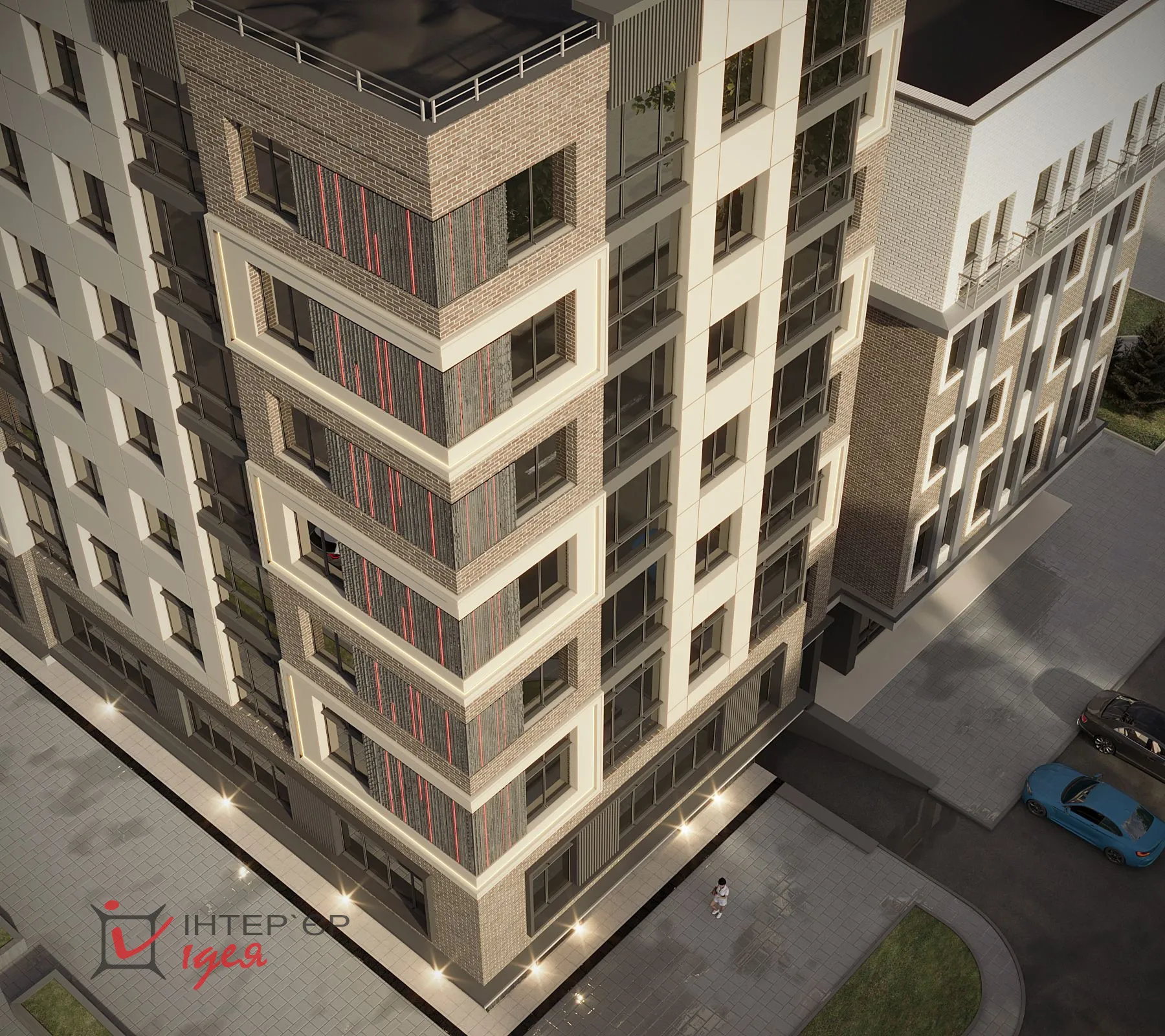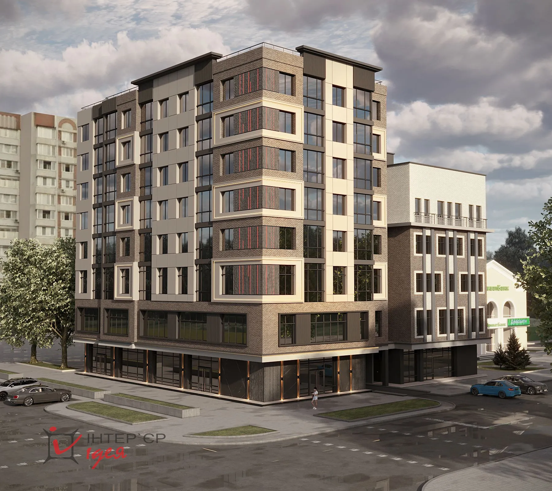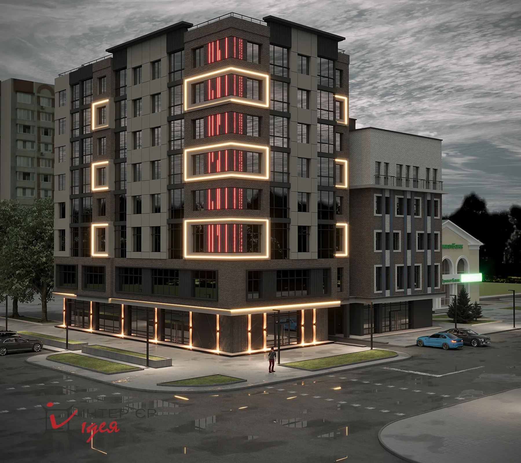 Фрагменти фасадів з високим склінням об'єднані в окремі вертикальні масиви за допомогою обробки чорним кольором та карнизами над парапетом.