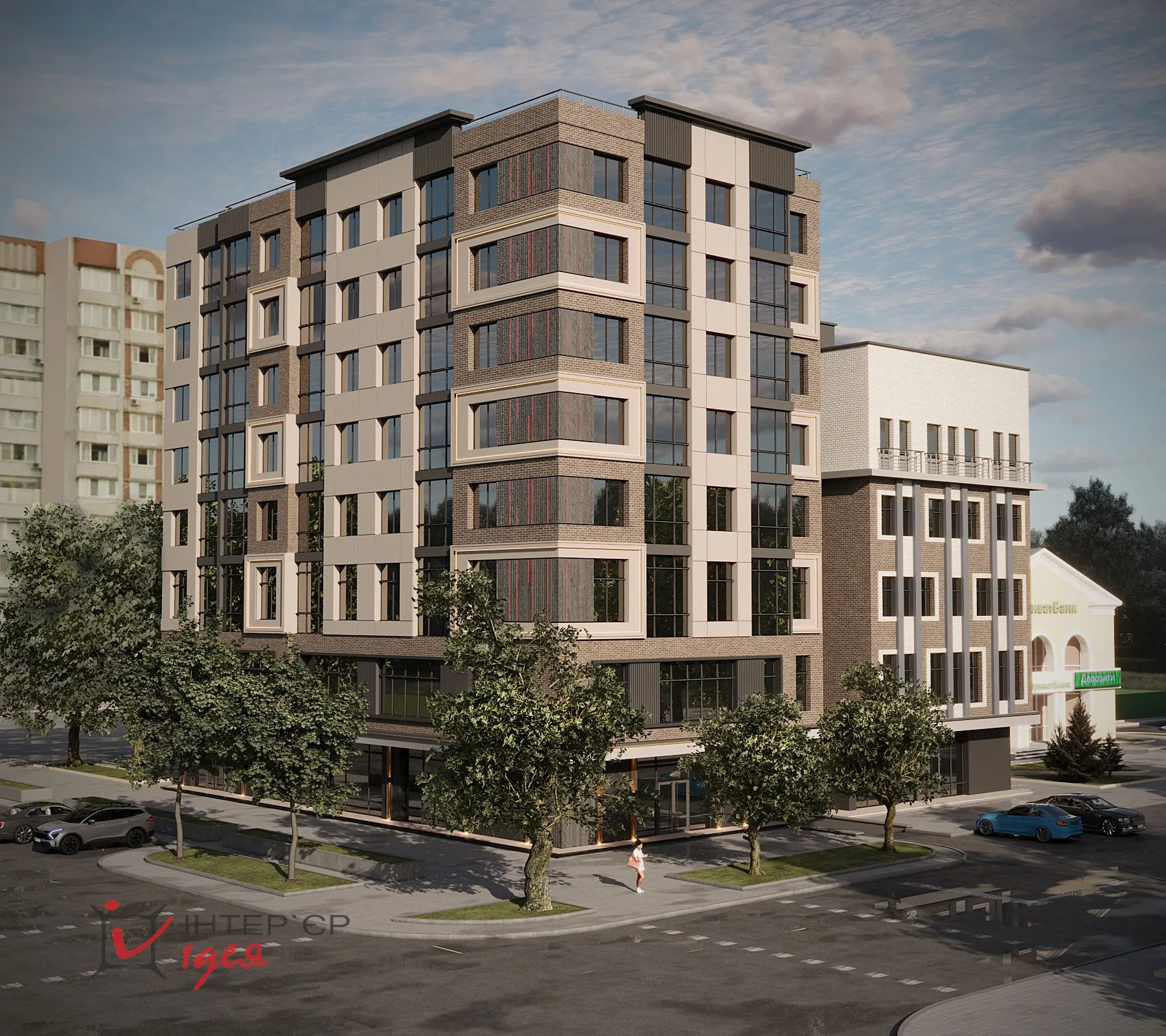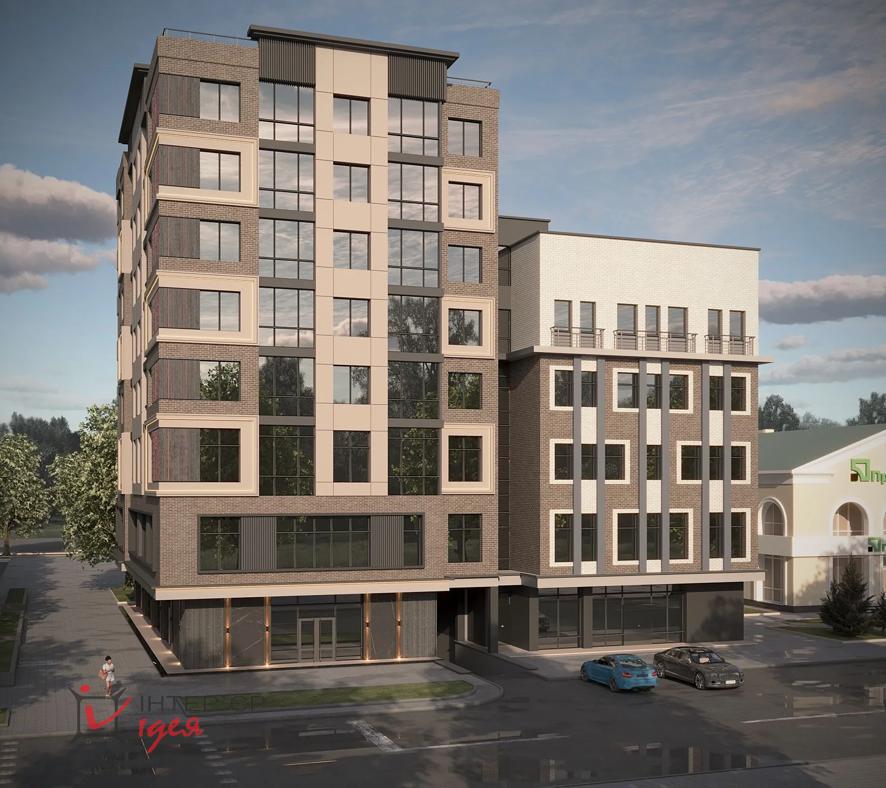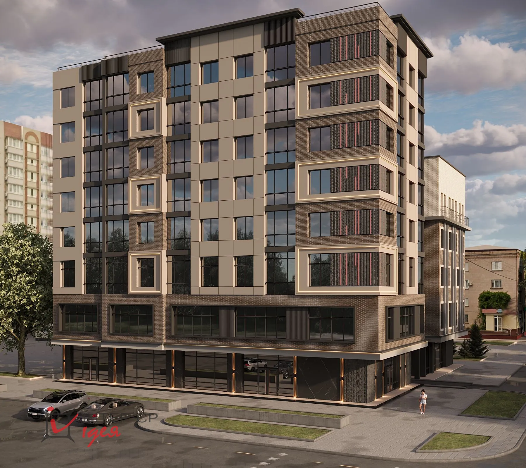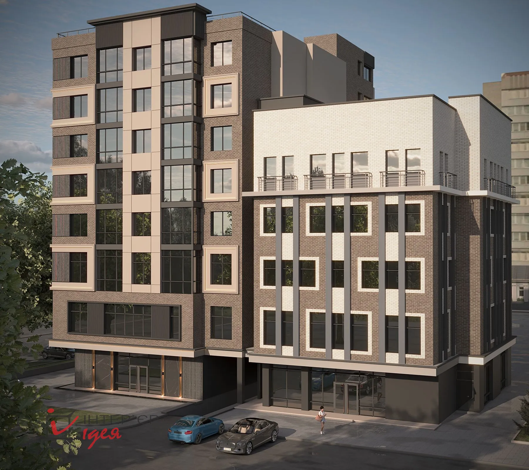 Фрагменти фасадів з високим склінням об'єднані в окремі вертикальні масиви за допомогою обробки чорним кольором та карнизами над парапетом.