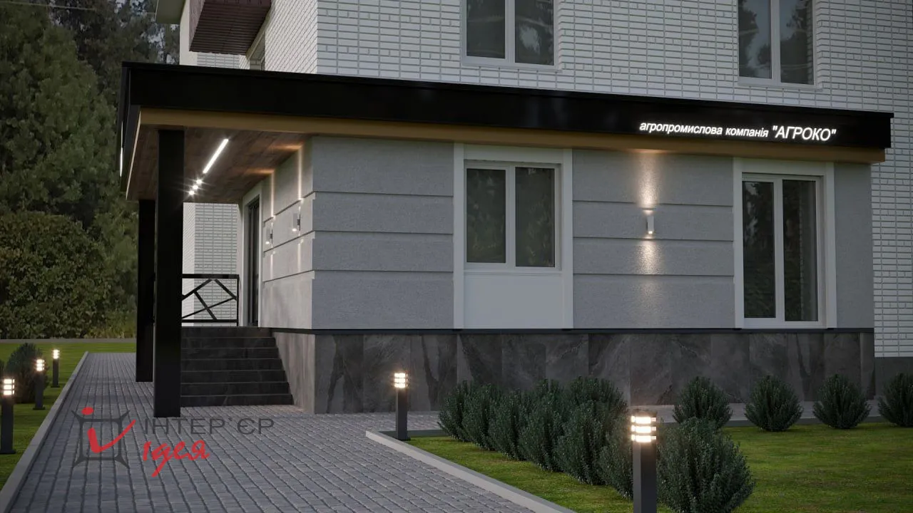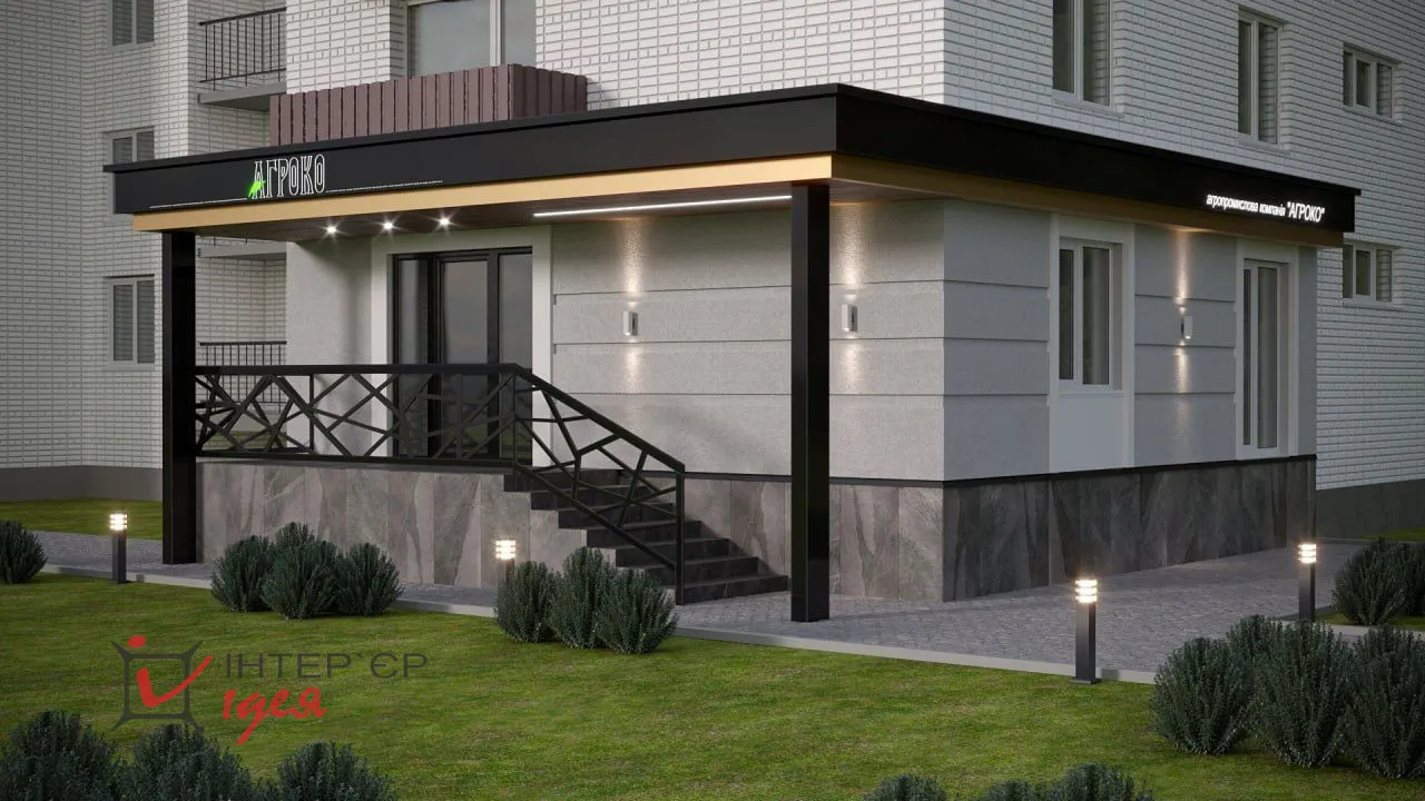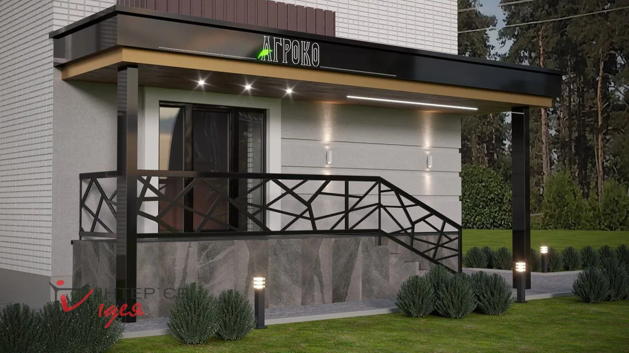 Над входом на фризі розташовується логотип, виконаний у вигляді об'ємних букв з внутрішнім підсвічуванням. На бічній частині фризу вифрезерована назва підприємства. Опори навісу також оброблені композитом.