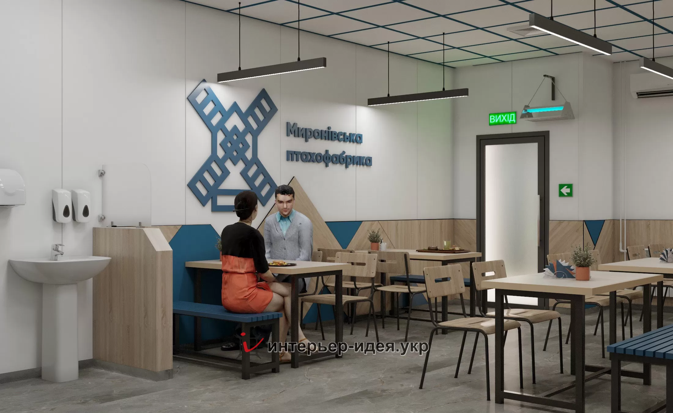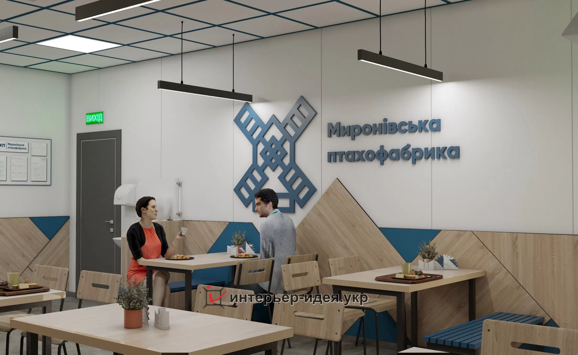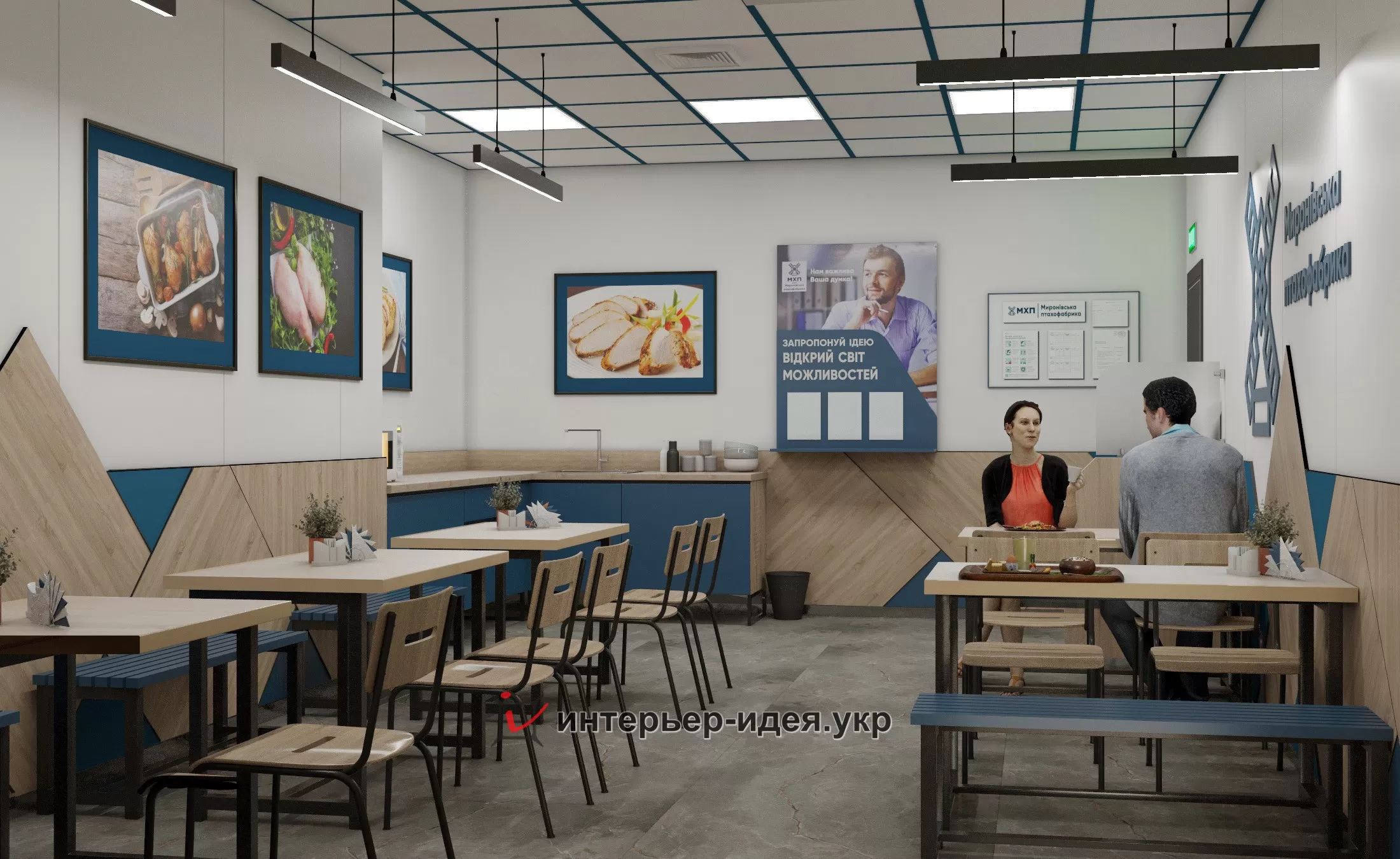Також стіни прикрашають плакати зі стравами продукції птахофабрики та фірмовий логотип.