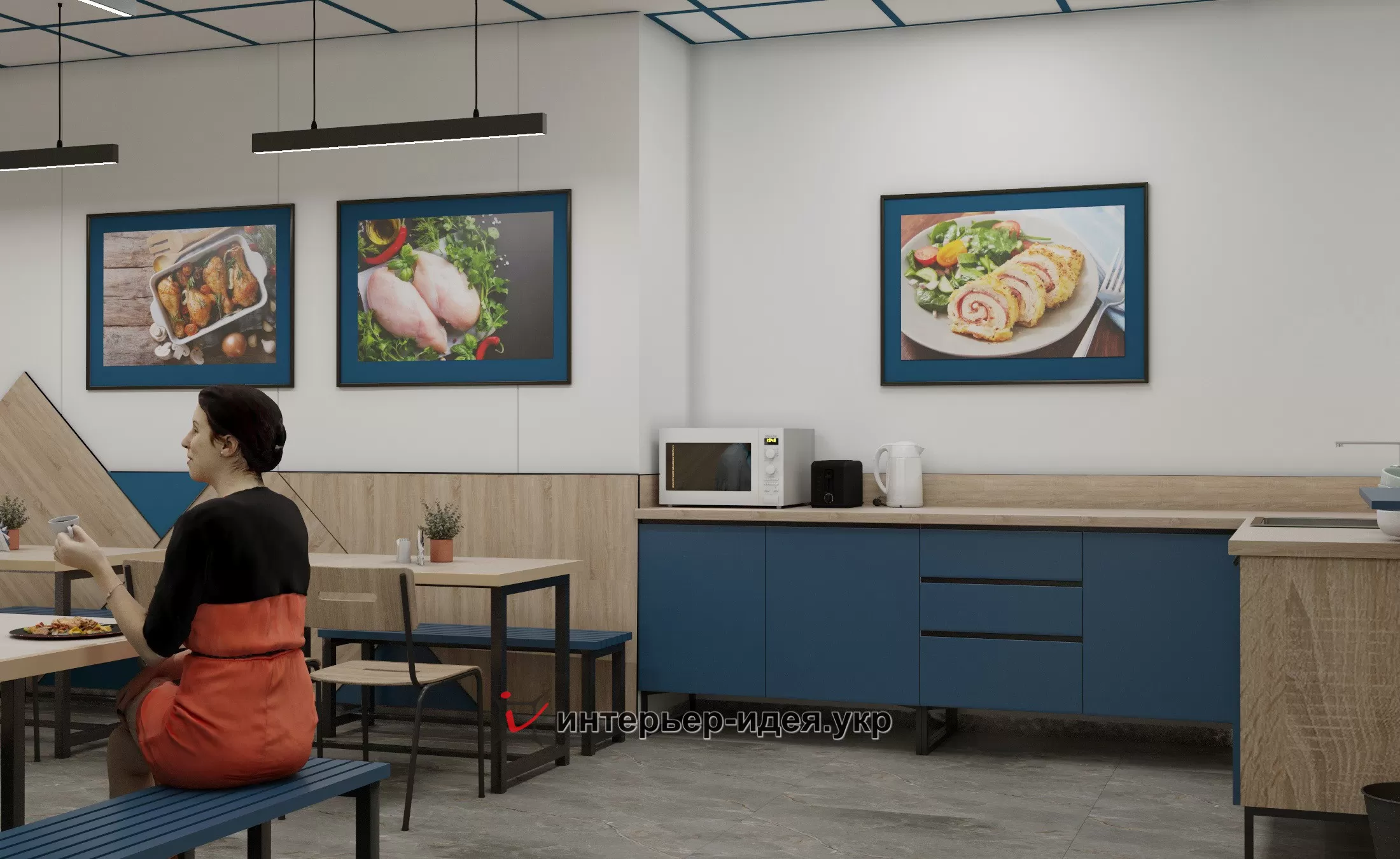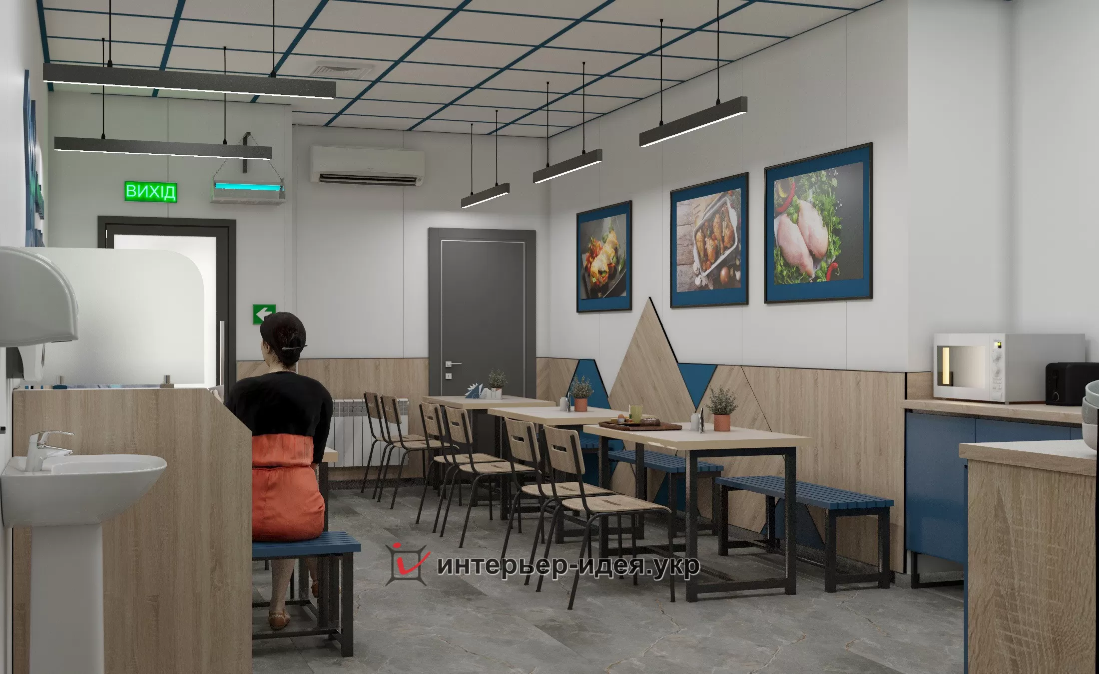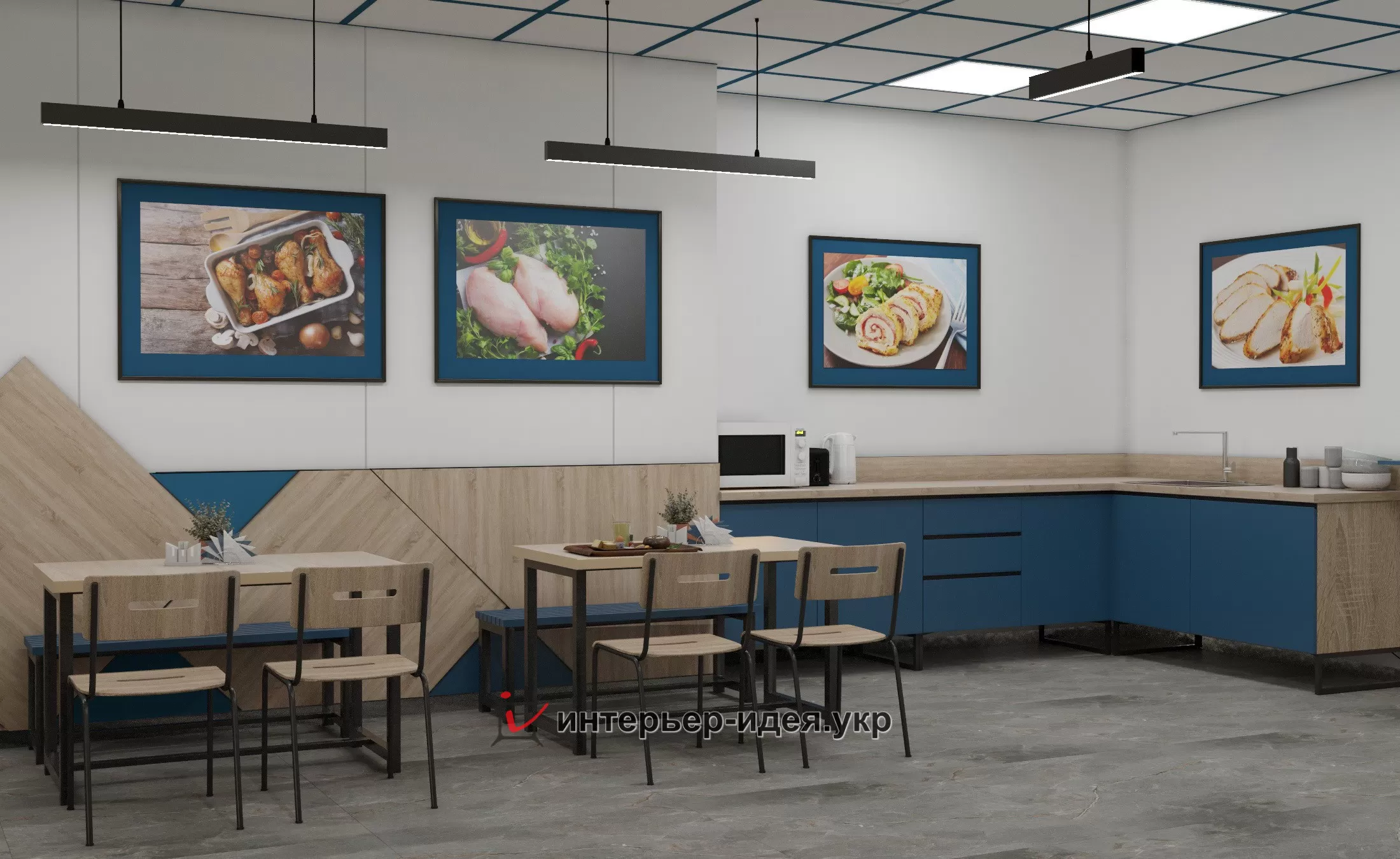 Також стіни прикрашають плакати зі стравами продукції птахофабрики та фірмовий логотип.