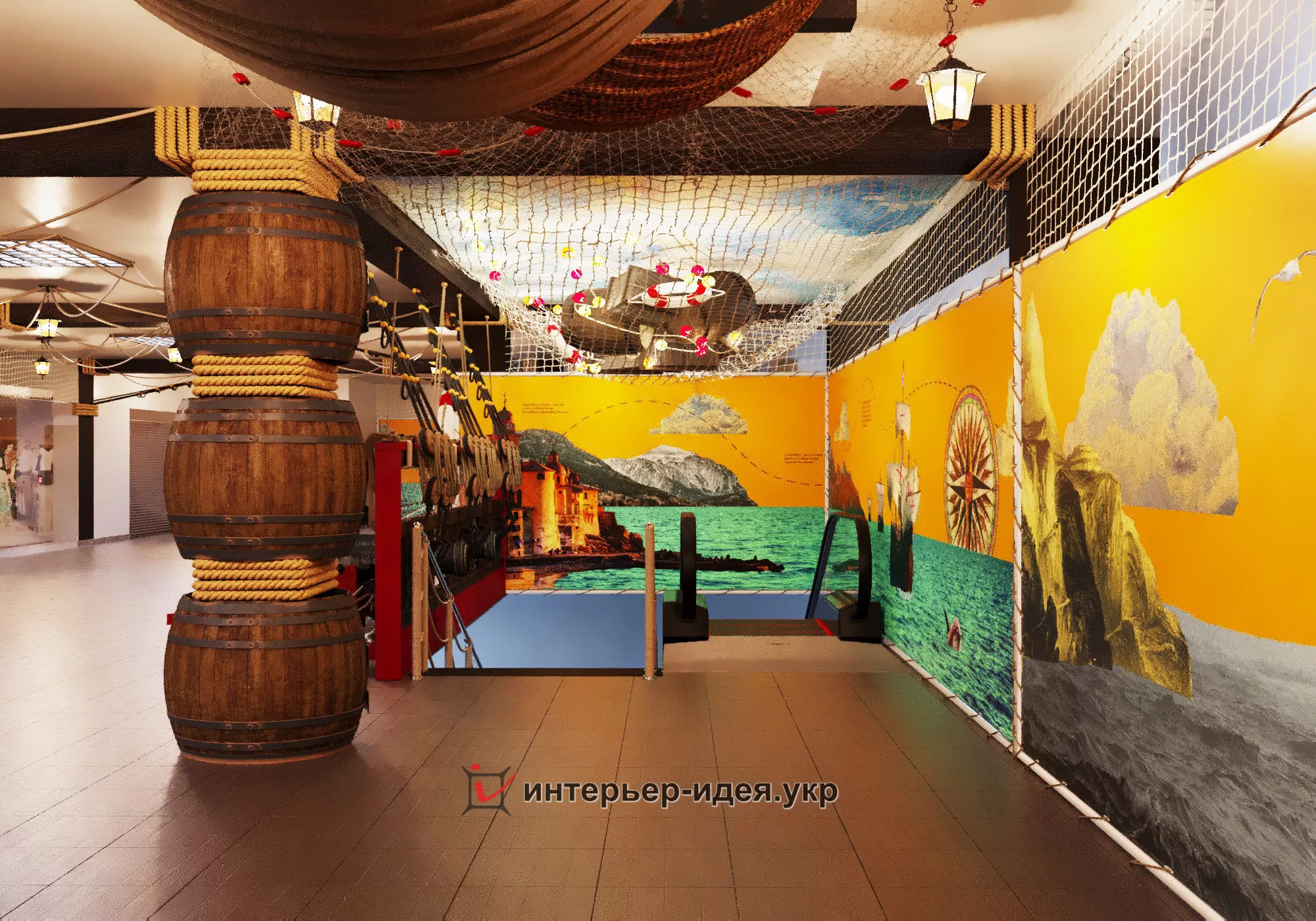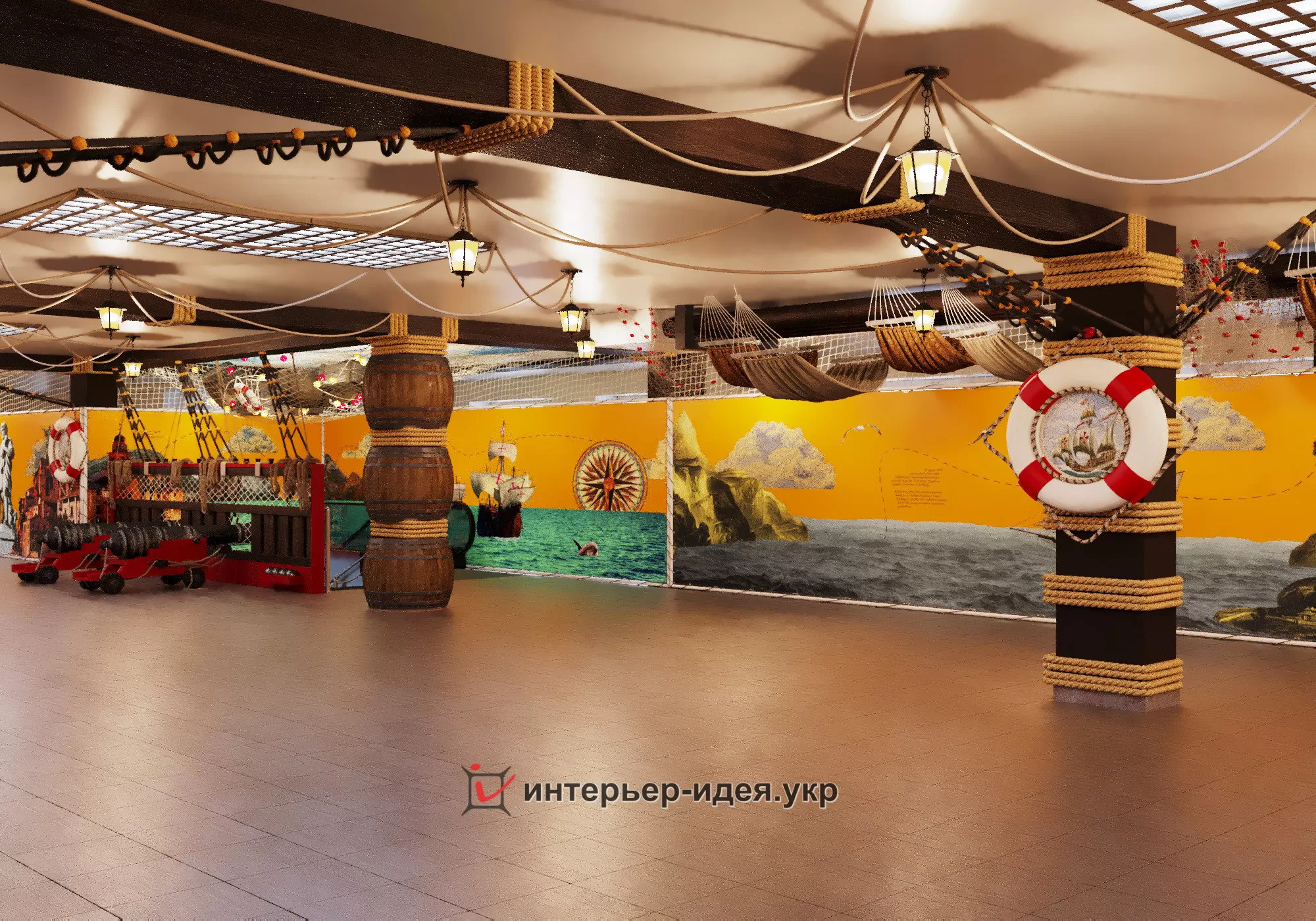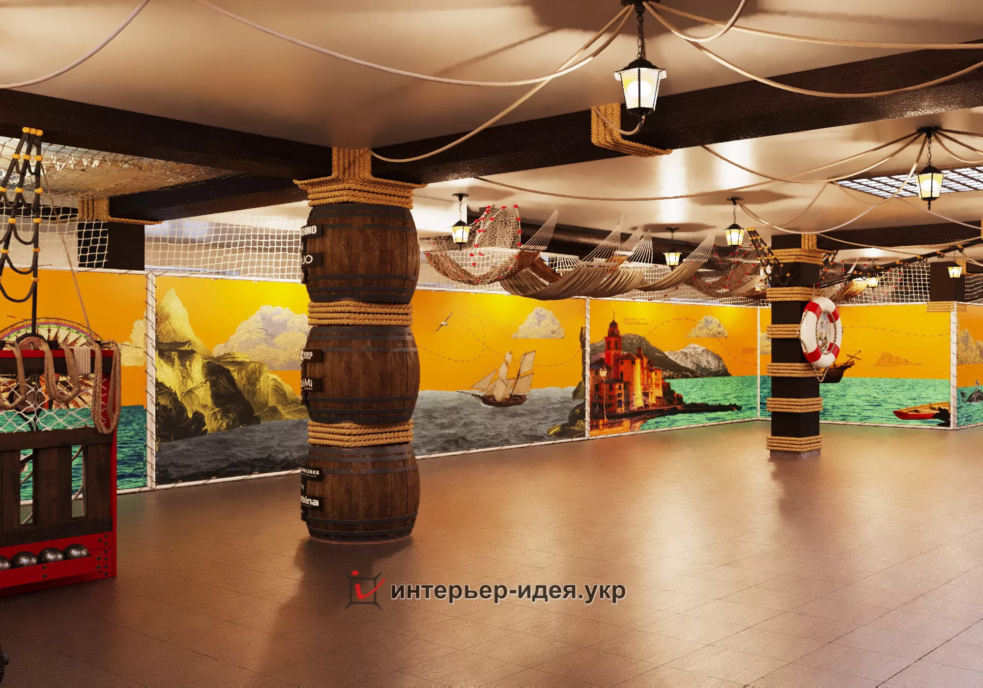 Елементи декору – бочки, сітки, канати, гамаки та інша морська атрибутика.