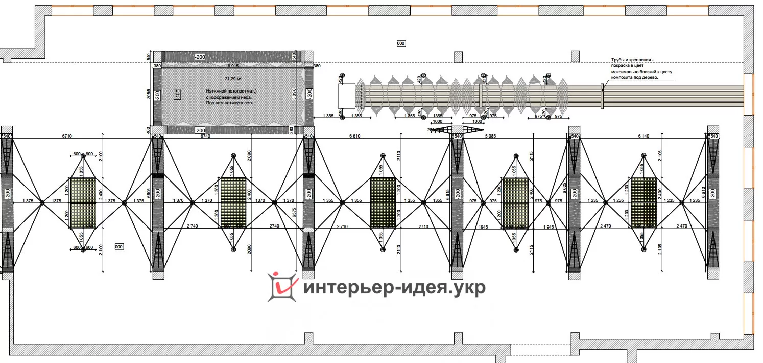 Щоб приховати нерівності стелі, поєднати світильники і максимально підтримати корабельну тематику, ми всі елементи стелі з'єднали обв'язкою канатів.