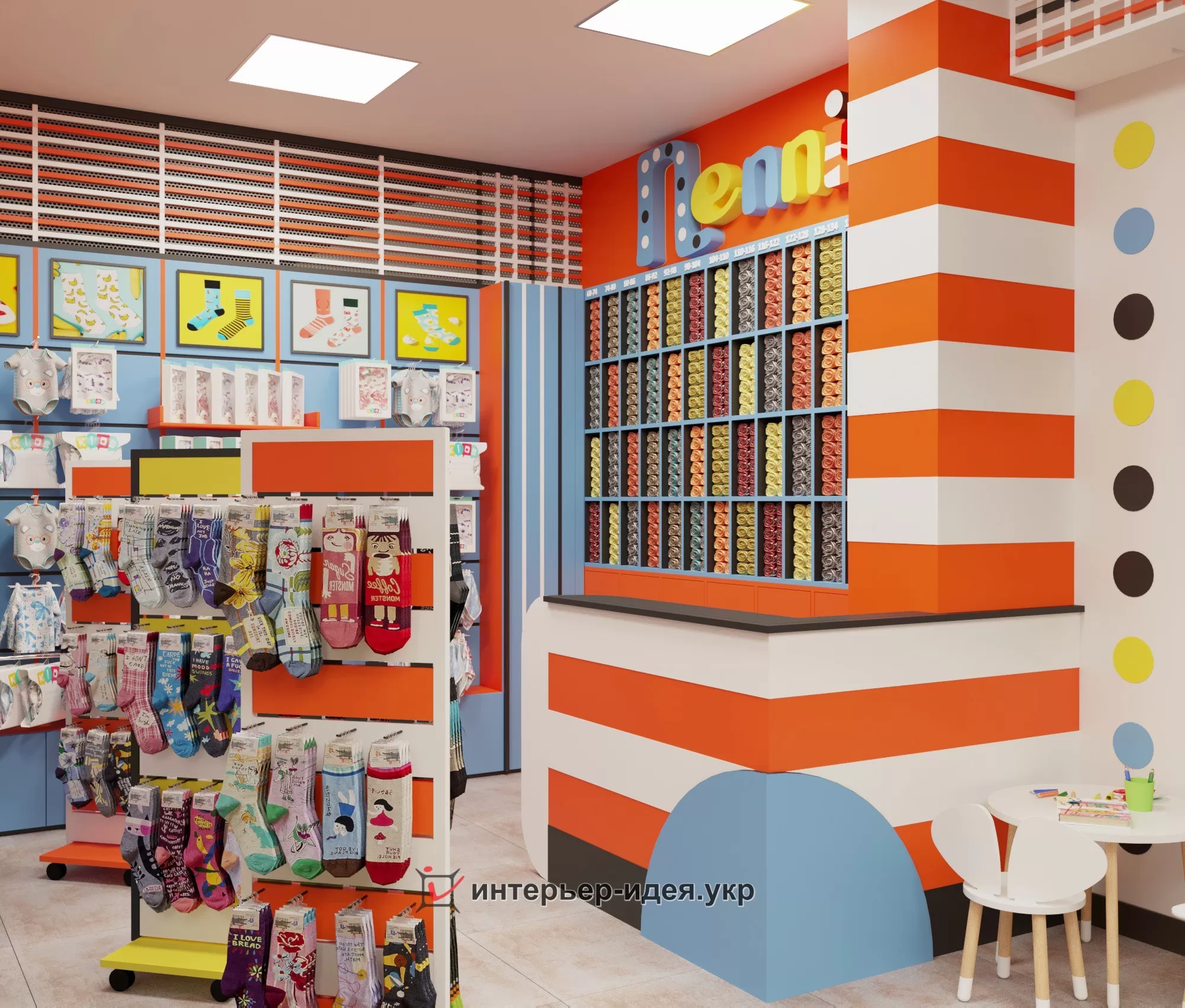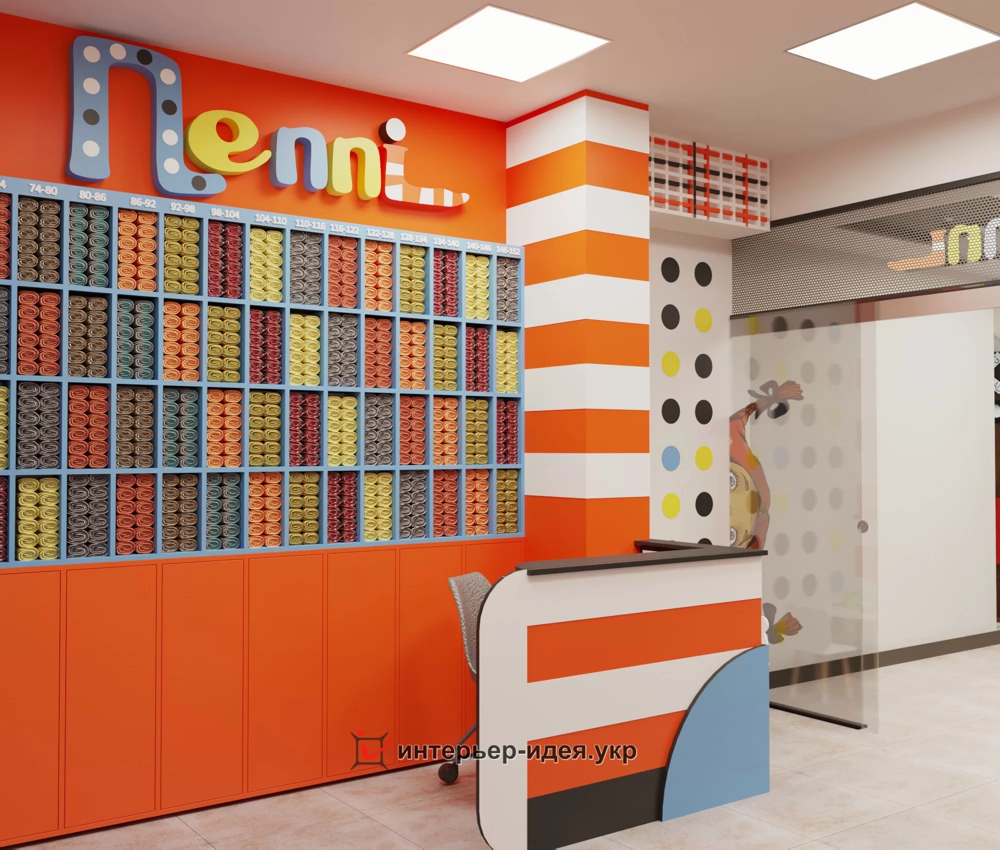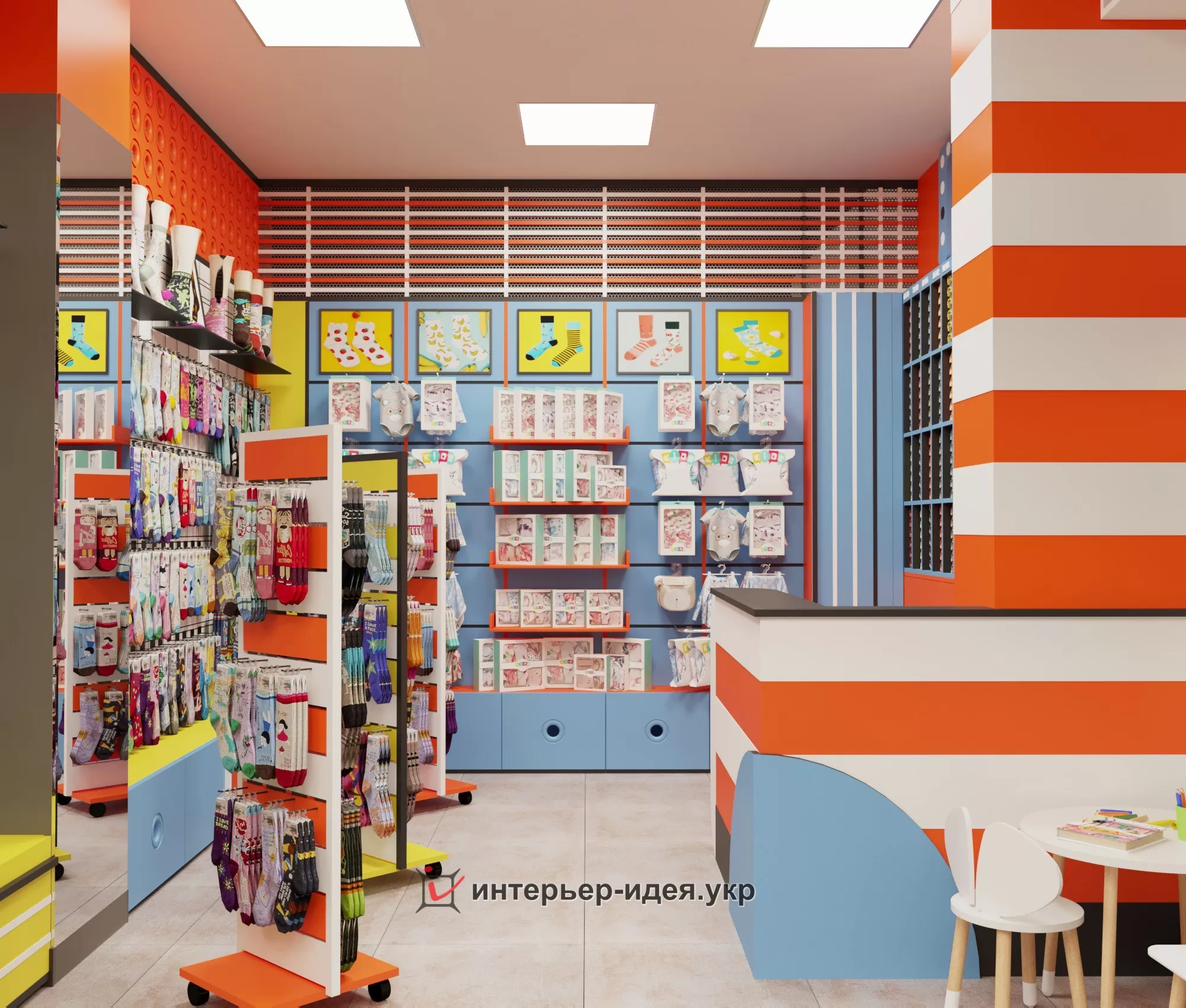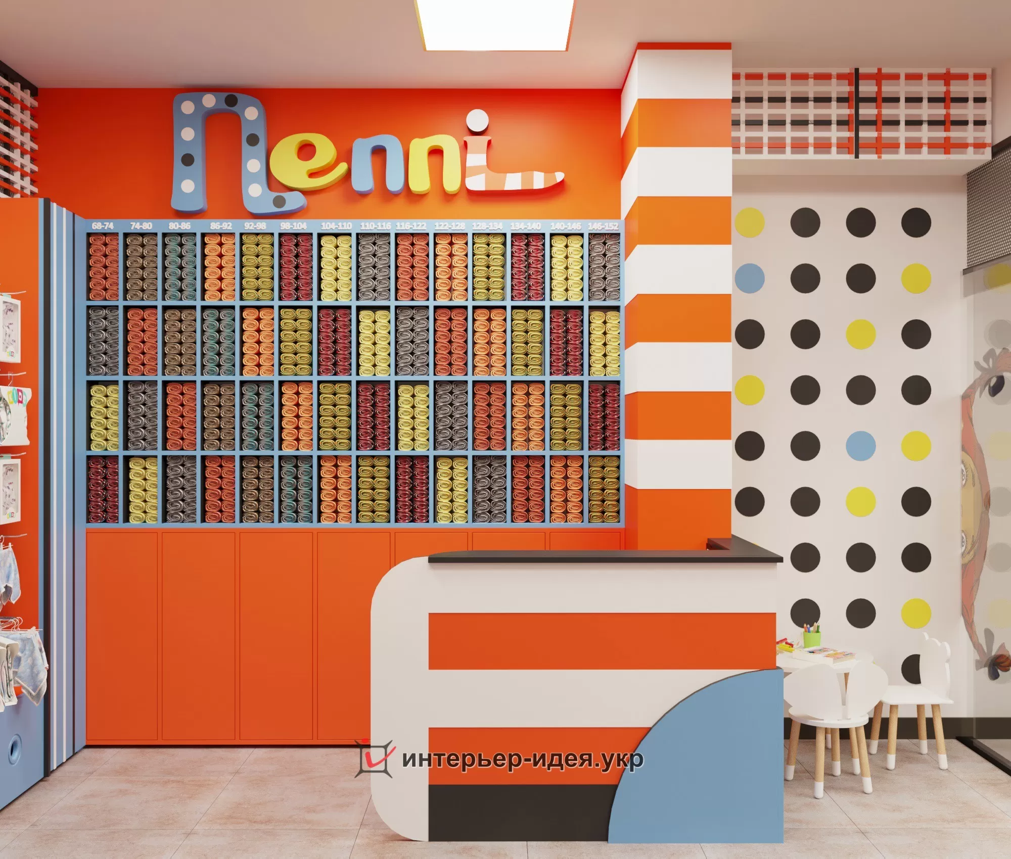 Яскраві кольори, різні геометричні форми в оформленні стін і стелажів.