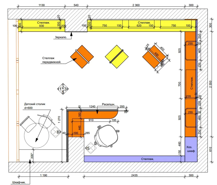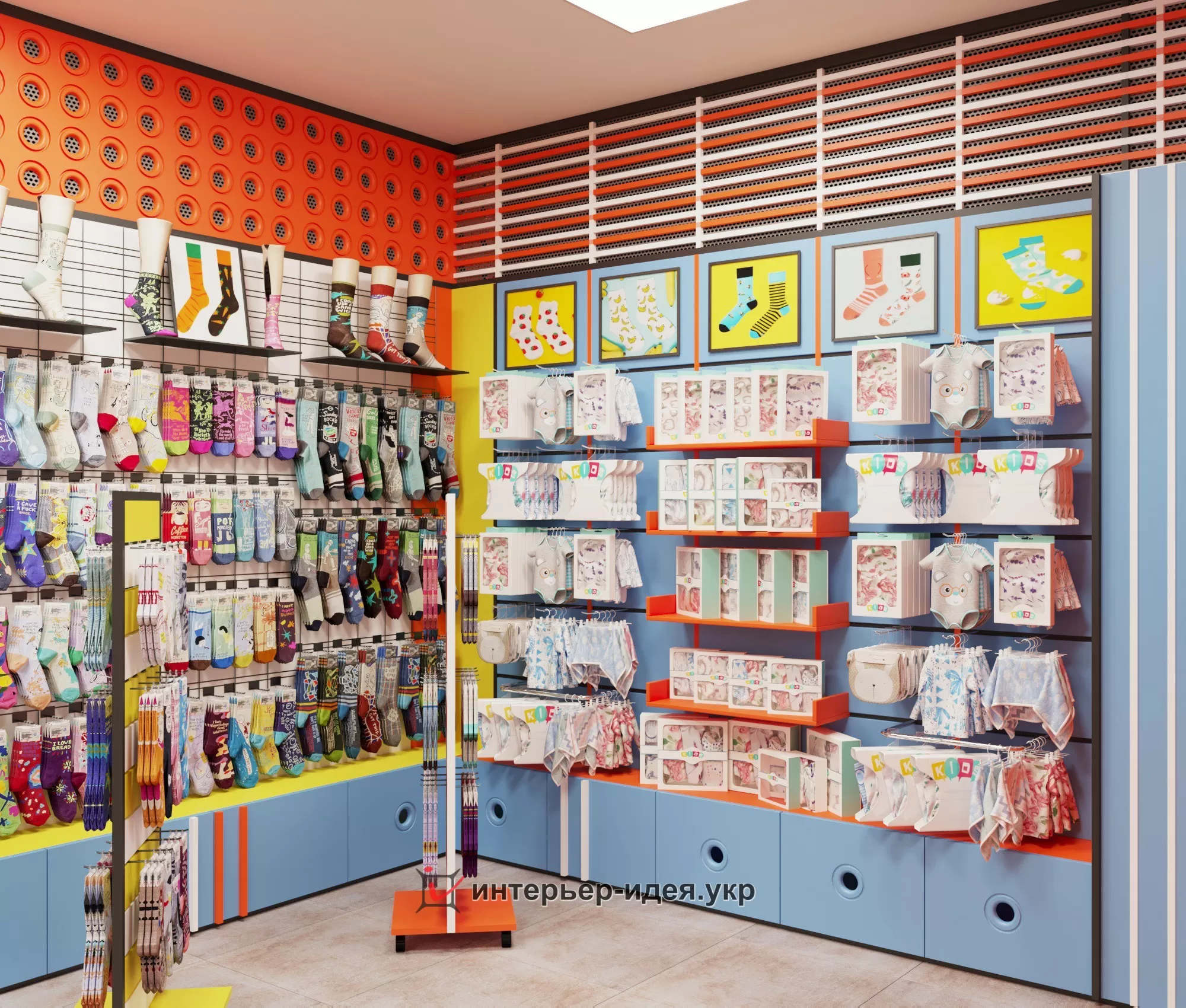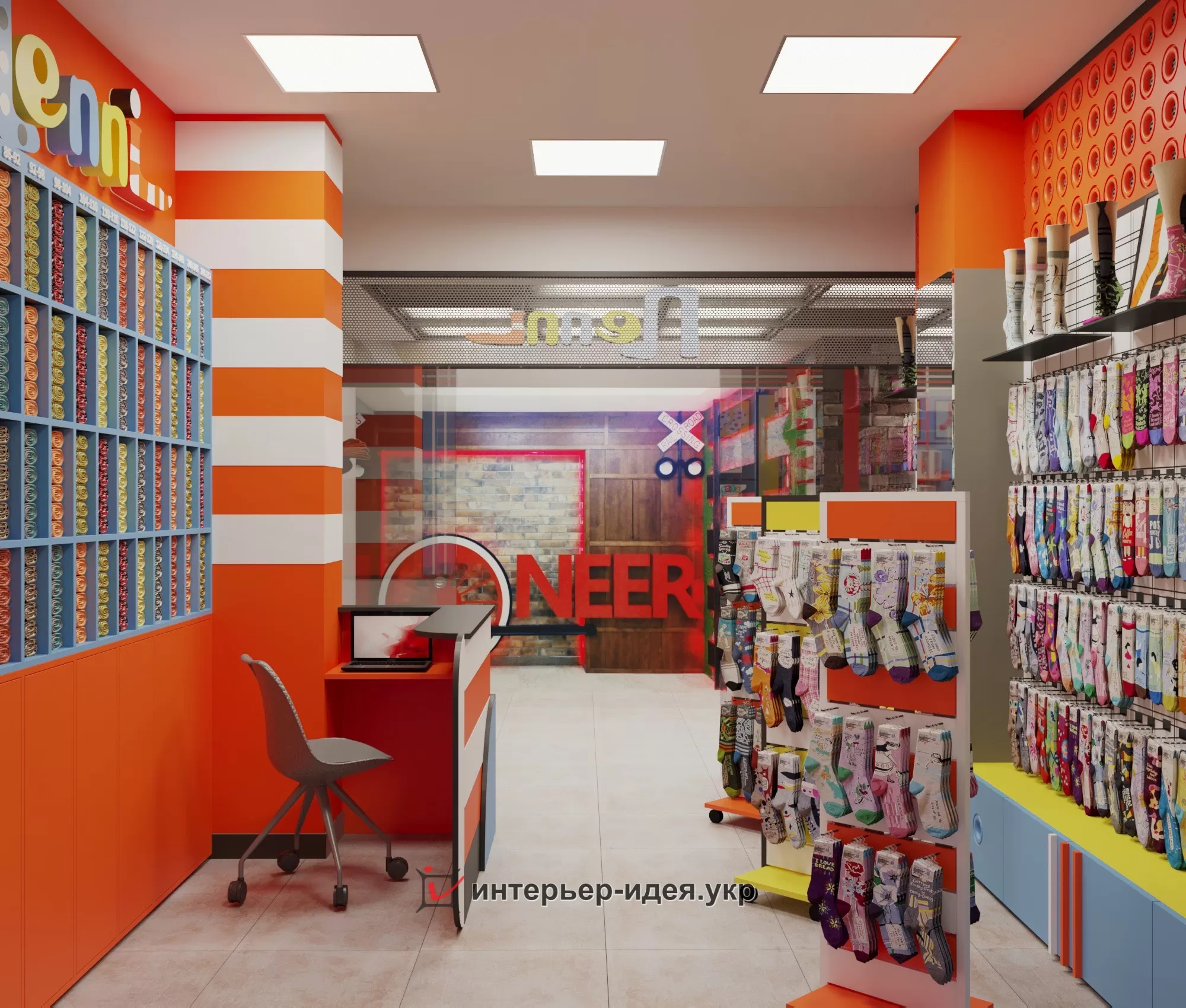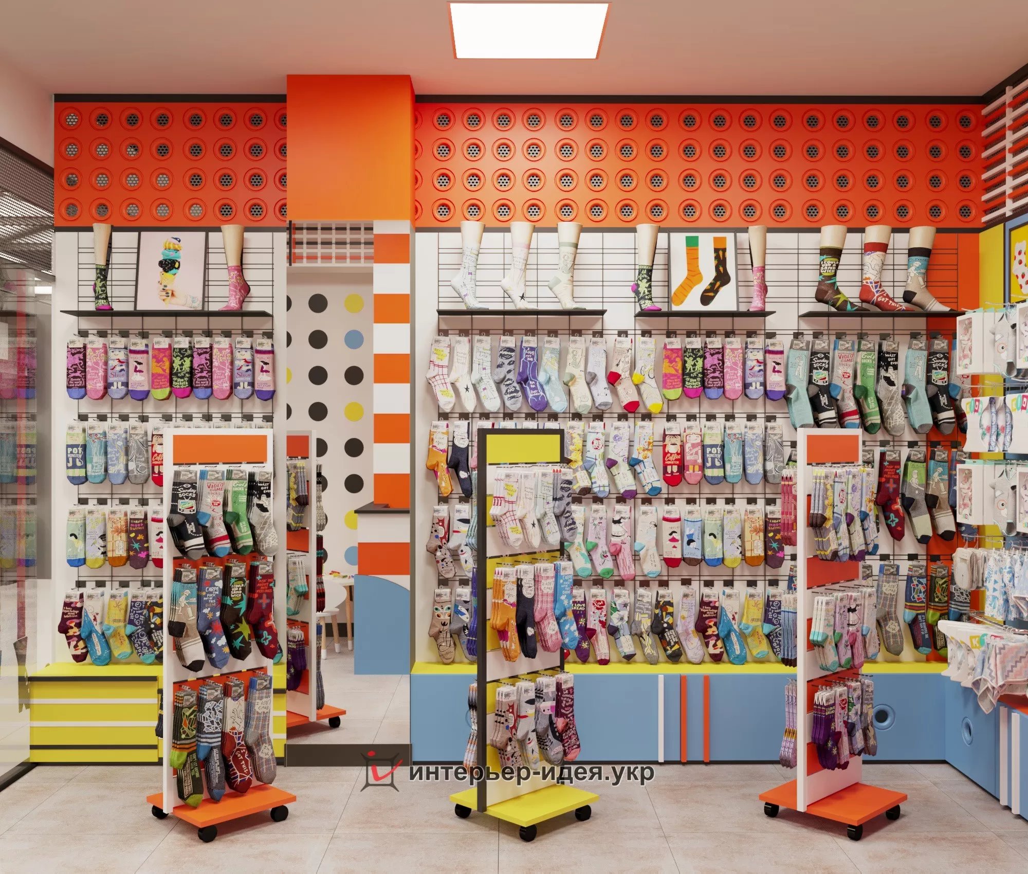 Яскраві кольори, різні геометричні форми в оформленні стін і стелажів.