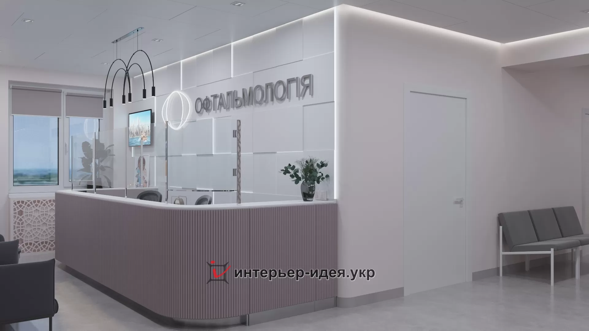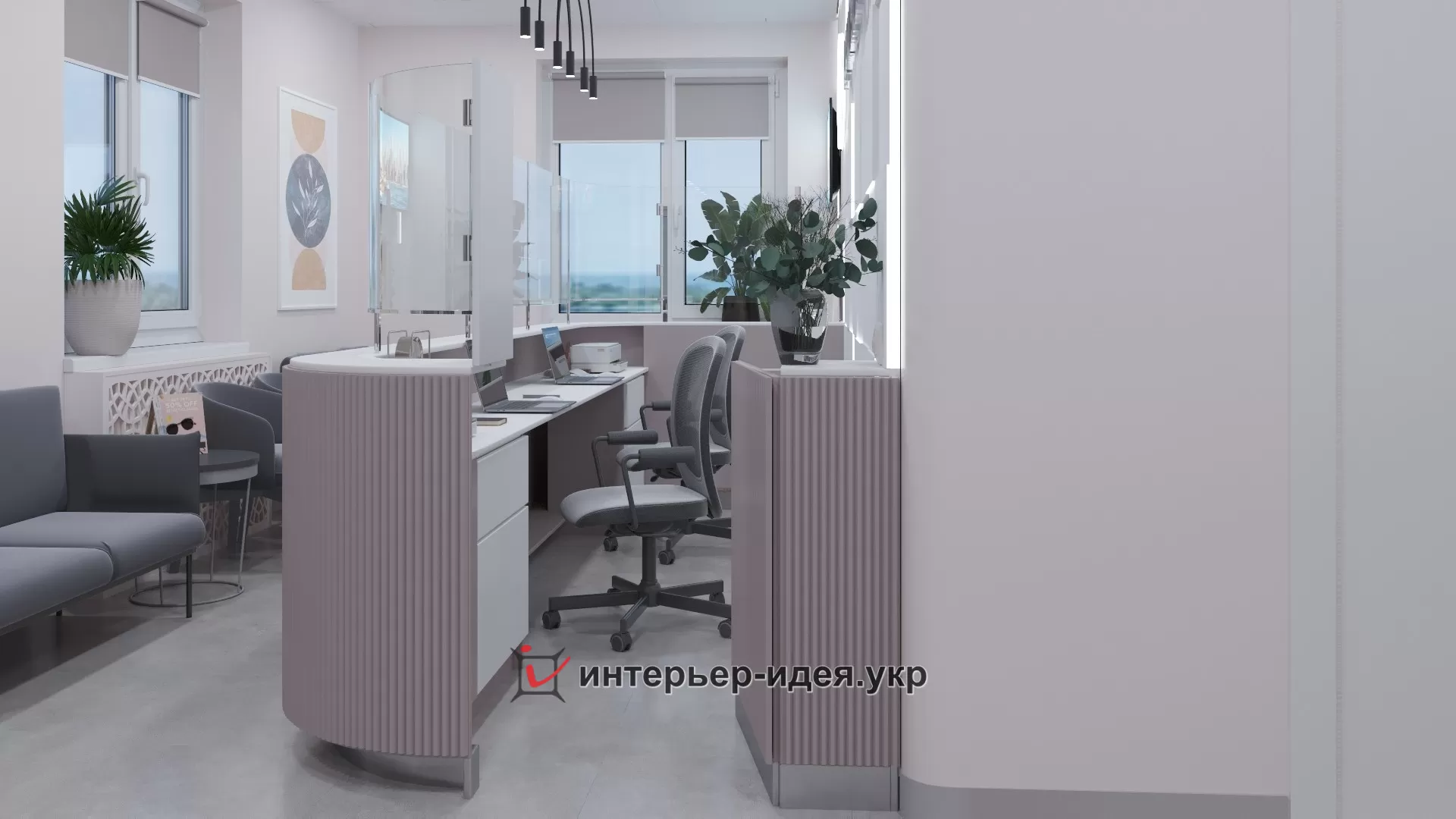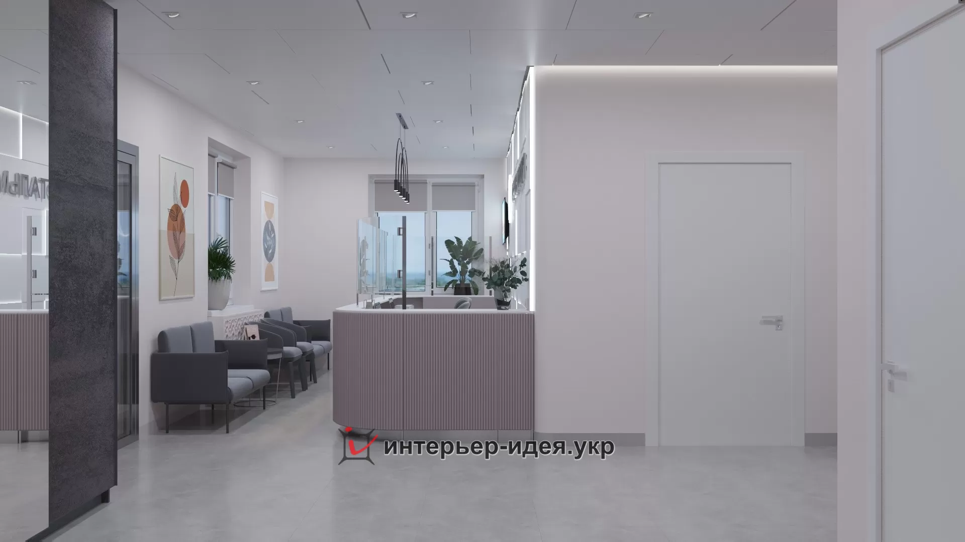 За побажанням замовника було спроектовано велику зручну рецепцію зі скляною перегородкою, де буде достатньо місця для роботи двох адміністраторів. Стійка меблів рецепції оздоблена дерев’яними рейками, пофарбованими у пастельний рожевий колір.