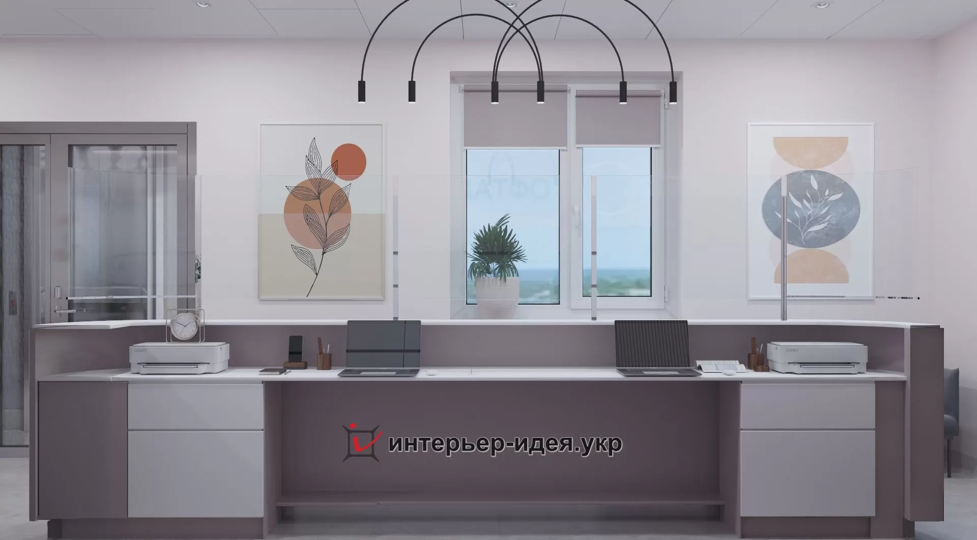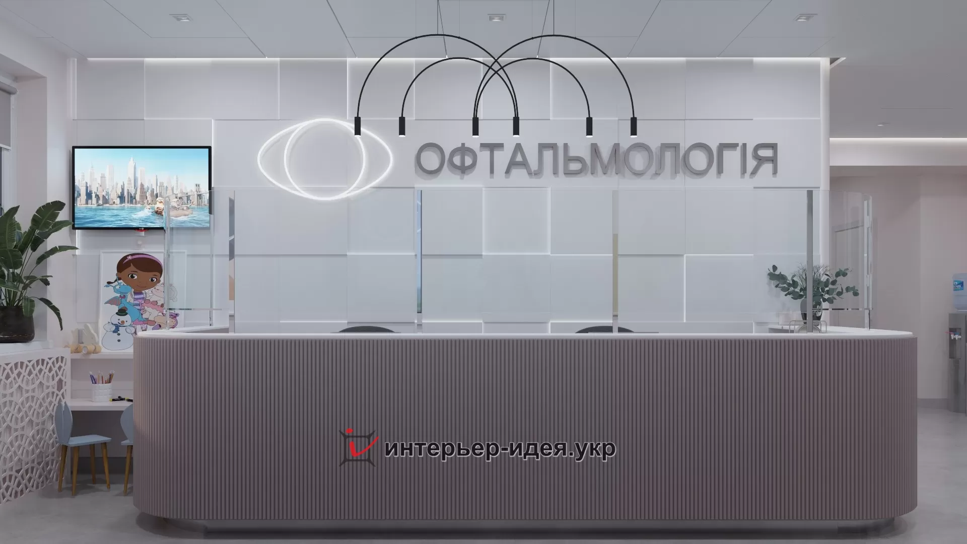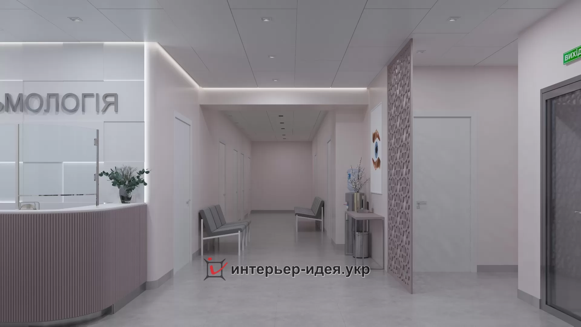 За побажанням замовника було спроектовано велику зручну рецепцію зі скляною перегородкою, де буде достатньо місця для роботи двох адміністраторів. Стійка меблів рецепції оздоблена дерев’яними рейками, пофарбованими у пастельний рожевий колір.
