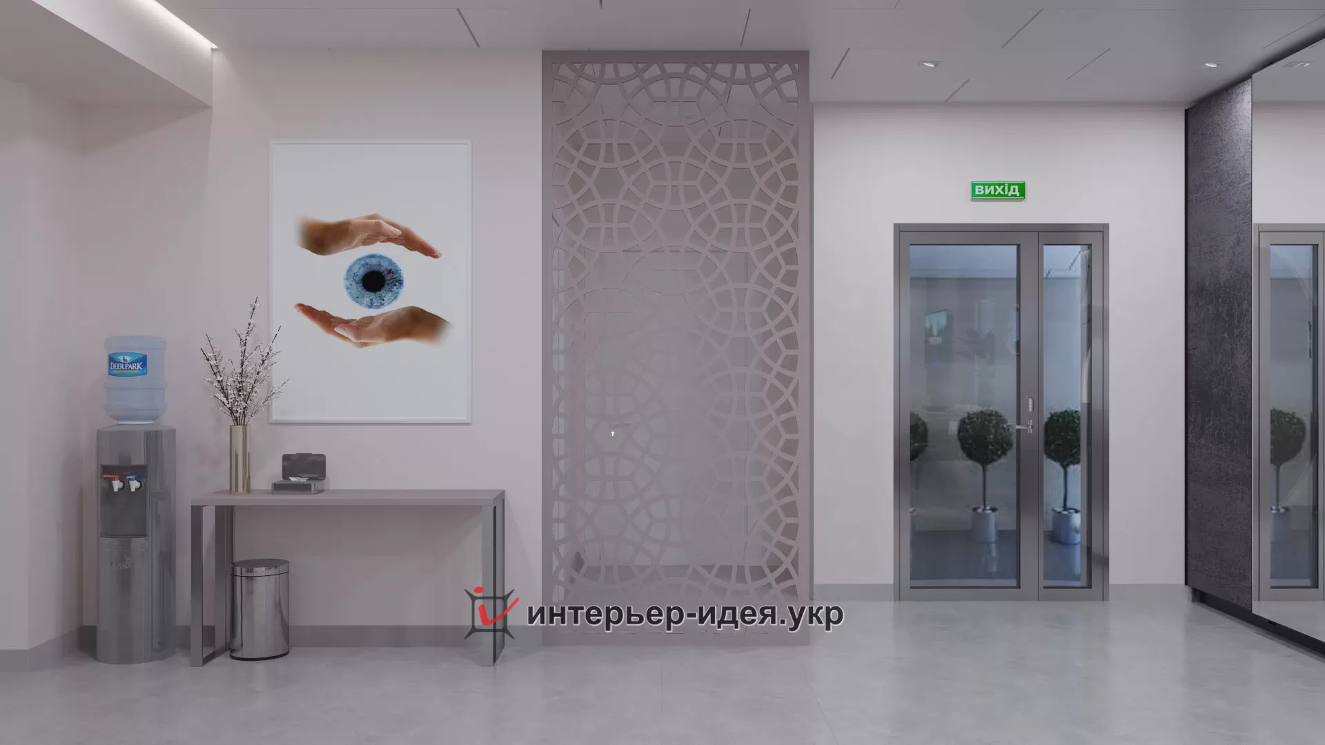 Стіна у зоні рецепції оформлена гіпсовими 3Д панелями Texturo (квадрати 450*450 з підсвіткою). Інші стіни пофарбовані у блідо-рожевий колір.