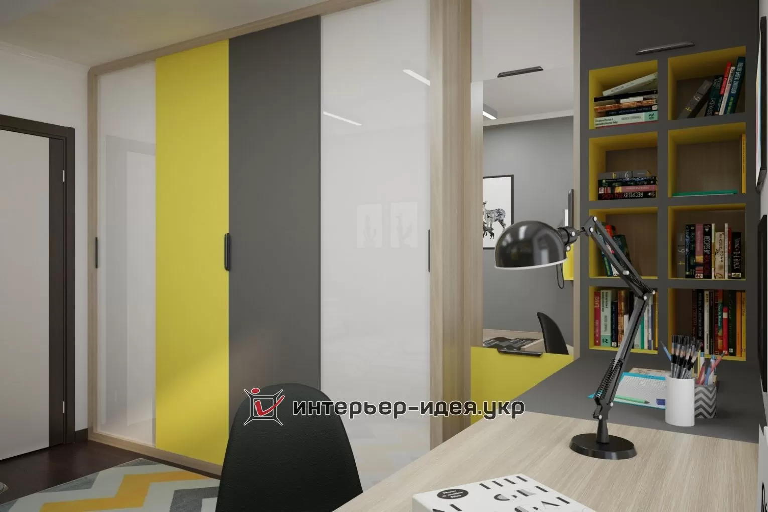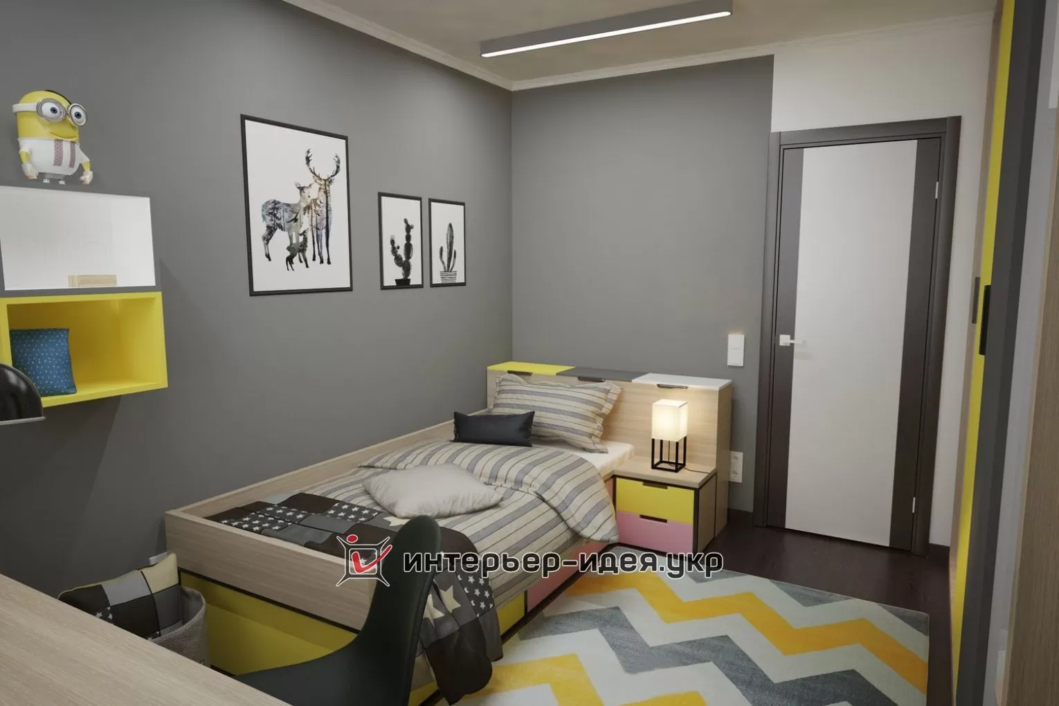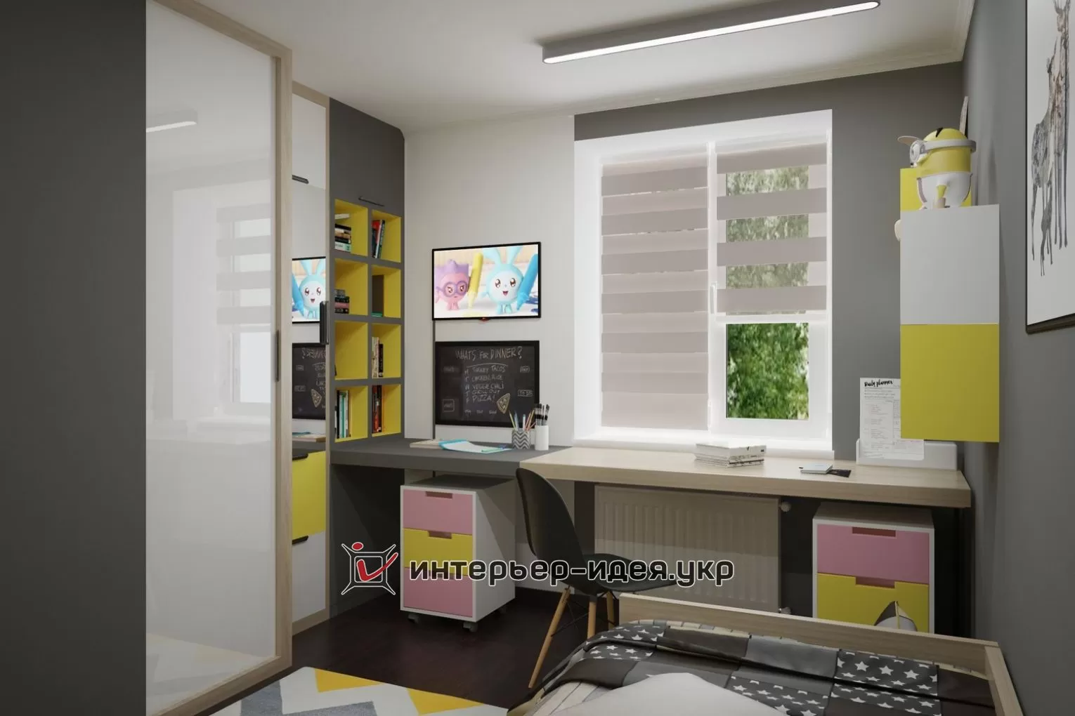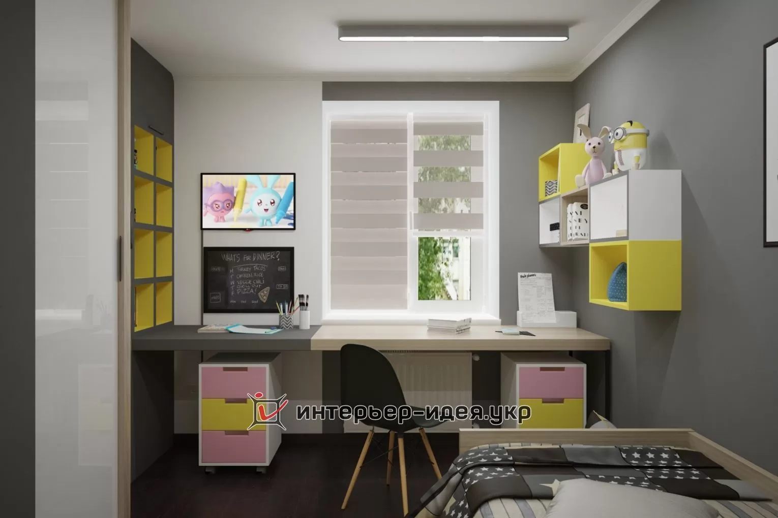 Дизайн-концепція. Головним завданням було зробити дизайн сучасним і вмістити всі речі для дівчинки. Тому були обрані яскраві акценти рожевого і жовтого, що додало кімнаті позитивного настрою. Зону відпочинку виділили сірою фарбою і підкреслили цим кольором двері шафи. Суцільний стіл біля вікна не зайняв багато місця і вмістив під собою дві тумбочки для шкільного приладдя. Шафа, яка плавно перейшла в стелаж, вмістила багато відділень для одягу і взуття.