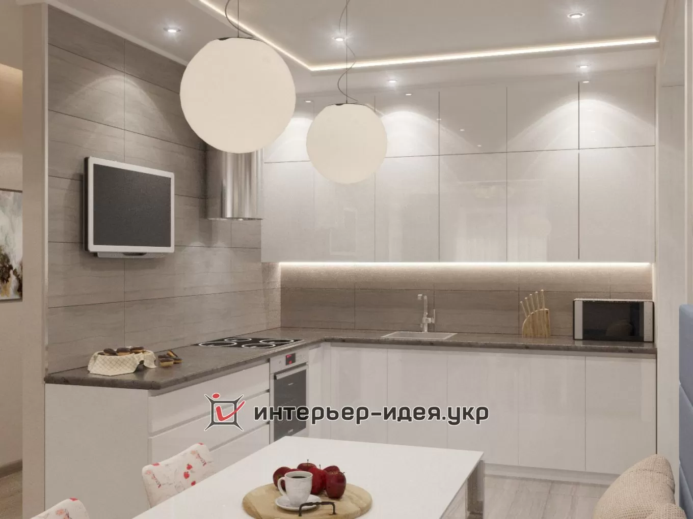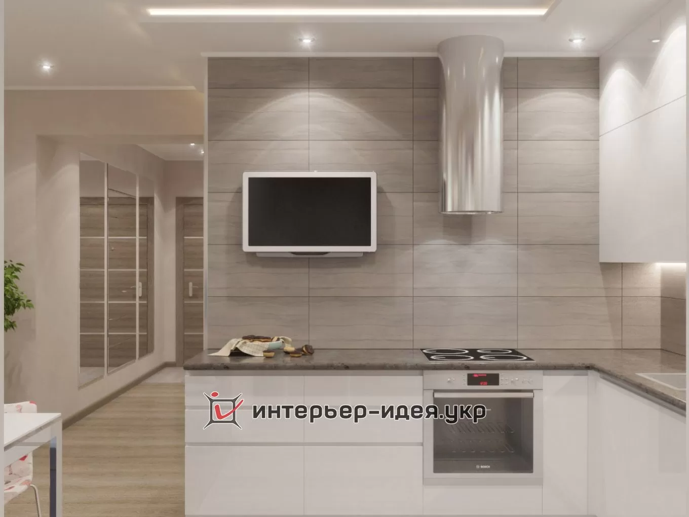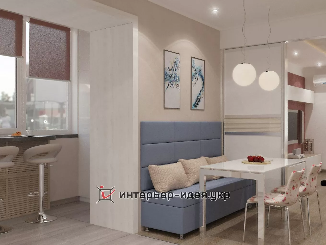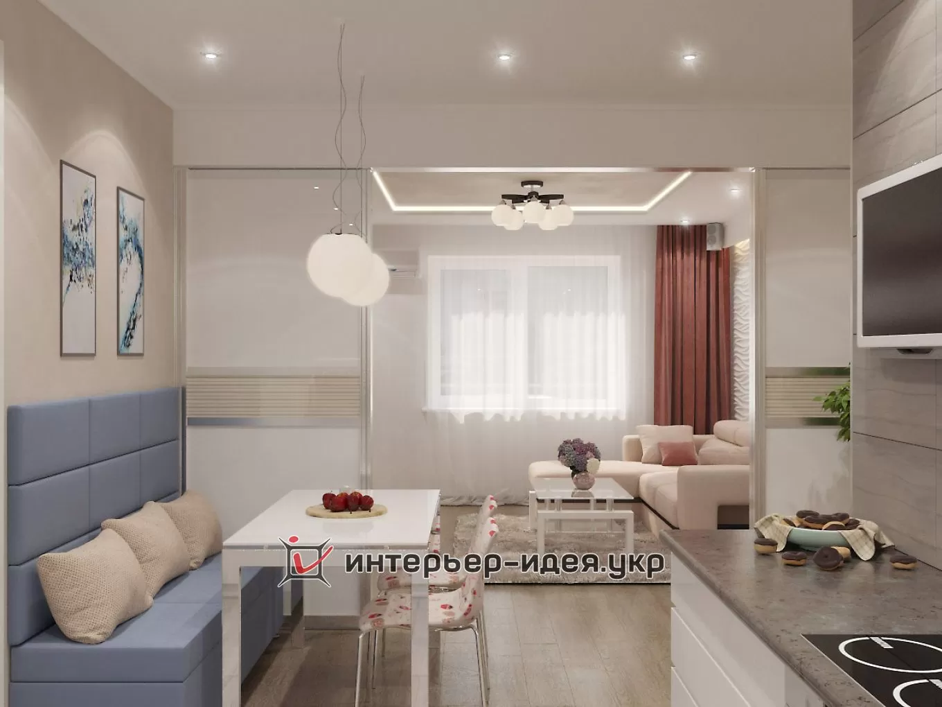 Ідея дизайну: Зробити один великий світлий функціональний простір кухні-студії для молодої сім'ї. Вся площа даного простору розділена на зону передпокою, коридору, кухні, їдальні і вітальні. Розсувні двері між кухнею і вітальнею дають можливість при необхідності відокремити ці два простори. Була обрана нейтральна колірна гамма з яскравими акцентами синього і бордового кольорів.