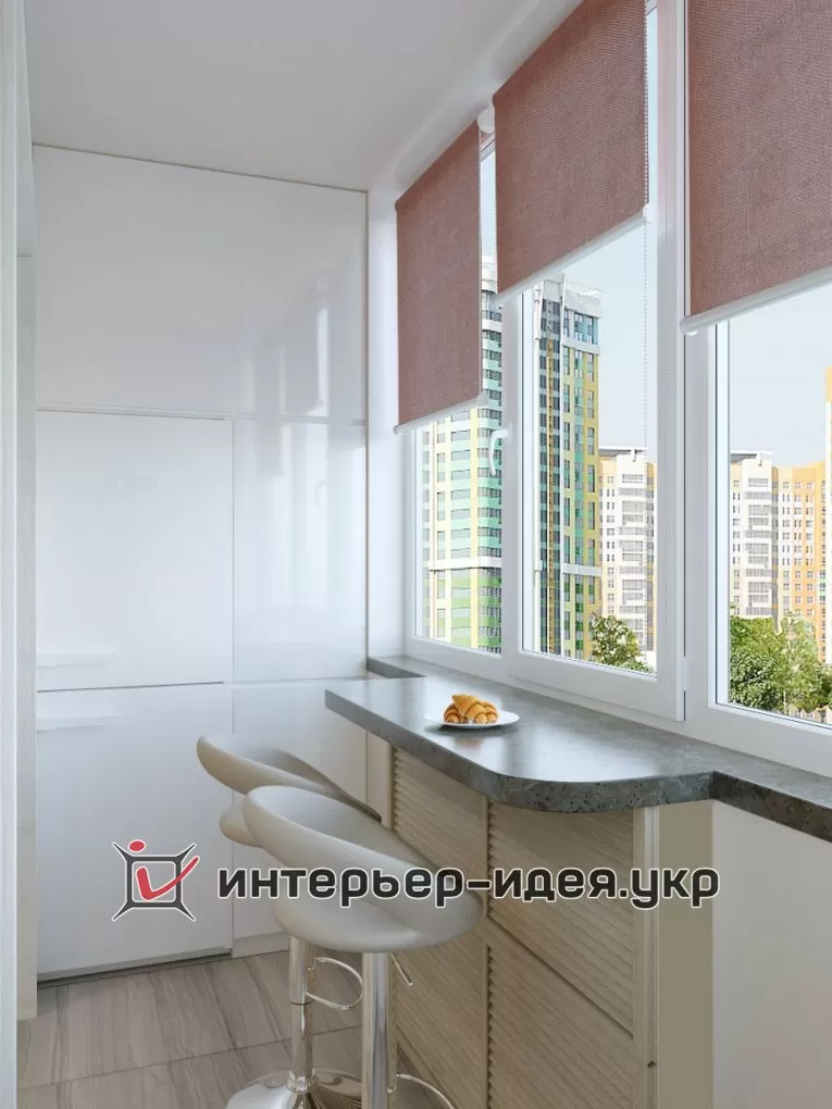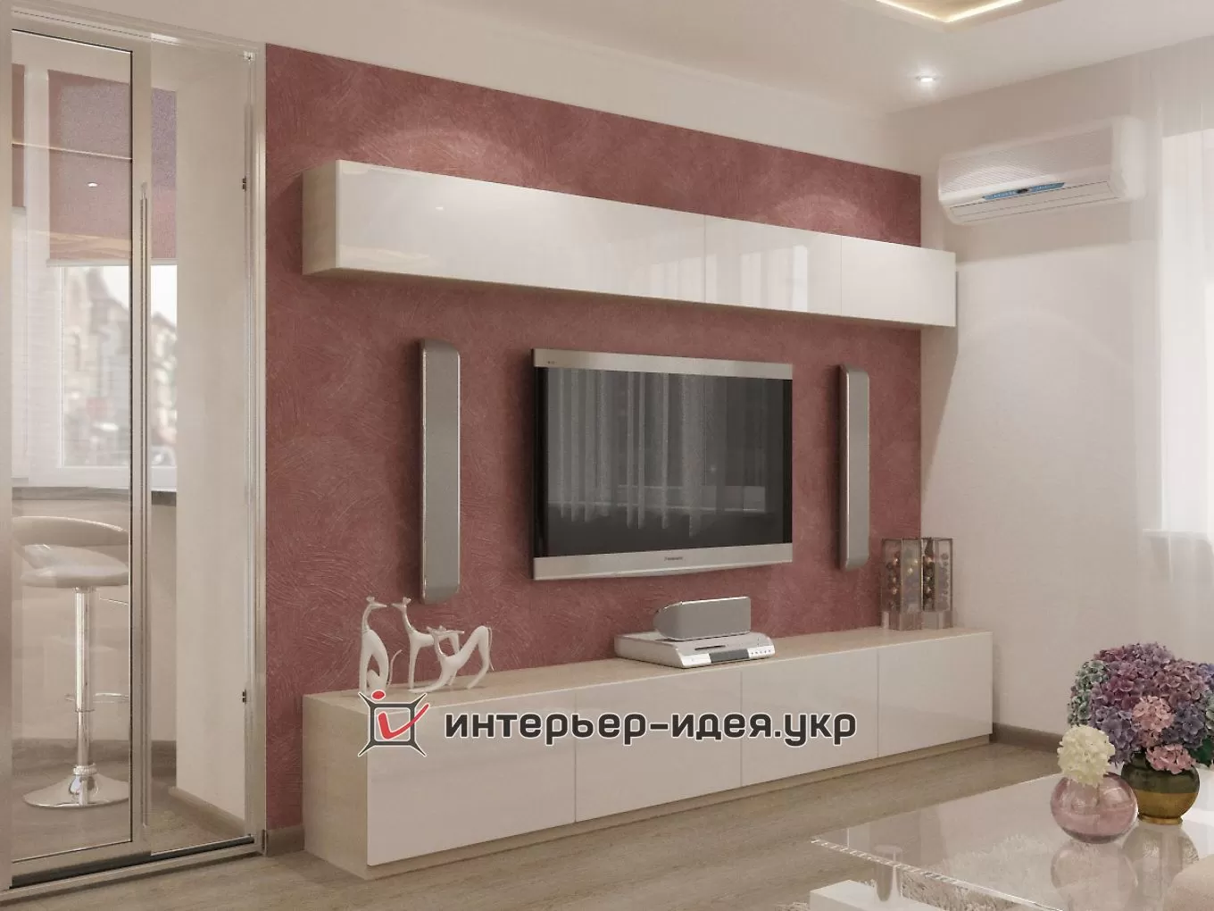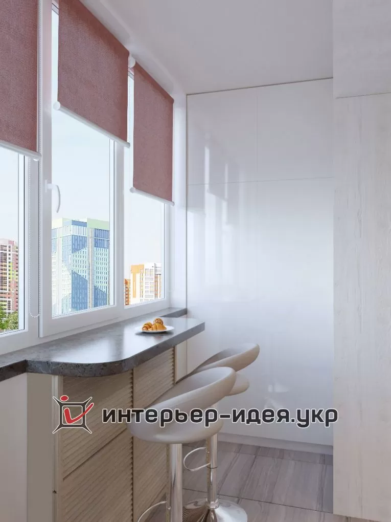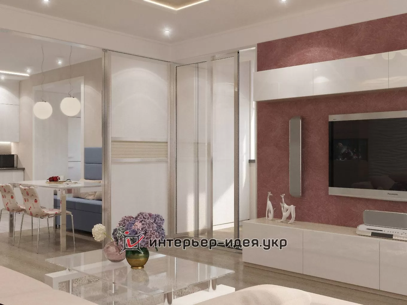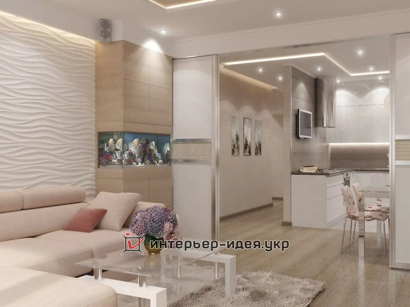 Ідея дизайну: Зробити один великий світлий функціональний простір кухні-студії для молодої сім'ї. Вся площа даного простору розділена на зону передпокою, коридору, кухні, їдальні і вітальні. Розсувні двері між кухнею і вітальнею дають можливість при необхідності відокремити ці два простори. Була обрана нейтральна колірна гамма з яскравими акцентами синього і бордового кольорів.