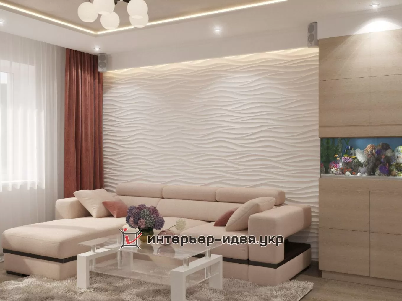 Основні матеріали використані в інтер'єрі: Декоративна штукатурка, паркетна дошка, м'які стінові панелі, плитка під камінь, 3D панелі, скло і дзеркало.