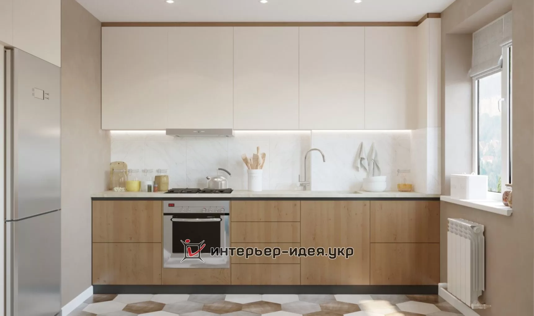Кухня виконана в кремових тонах у поєднанні зі шпонованим МДФ.