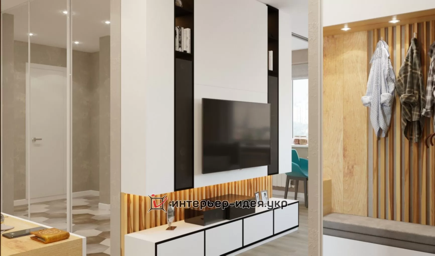 Функціональна ТБ-зона поміщає в себе існуючу техніку, ТВ діагоналлю 55 дюймів, висувні полки і місткі шафки.