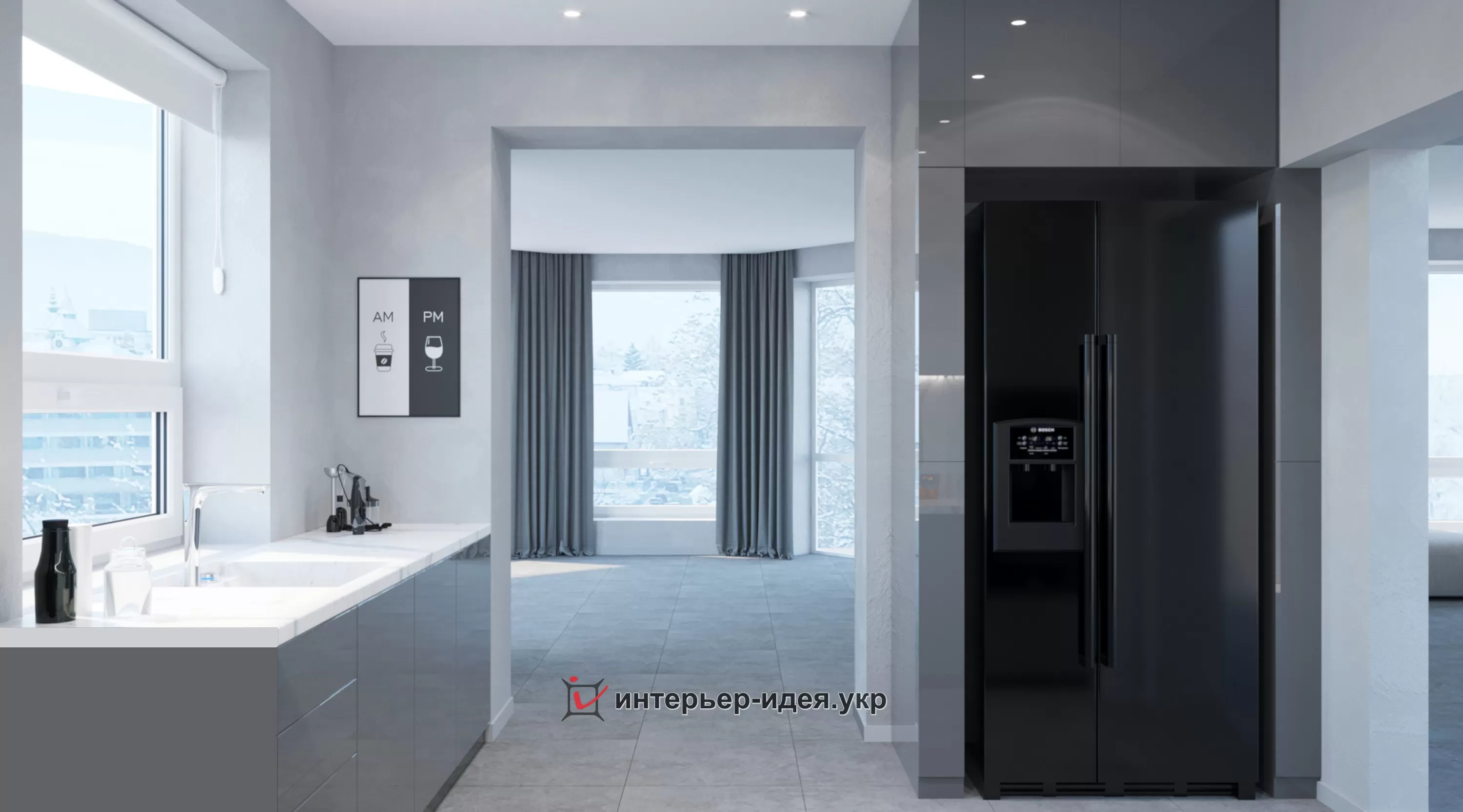 Проект був розроблений в сірих і темних тонах - ці відтінки візуально розширюють приміщення і збільшують простір, а також свідчать про вишуканість смаку господарів.
