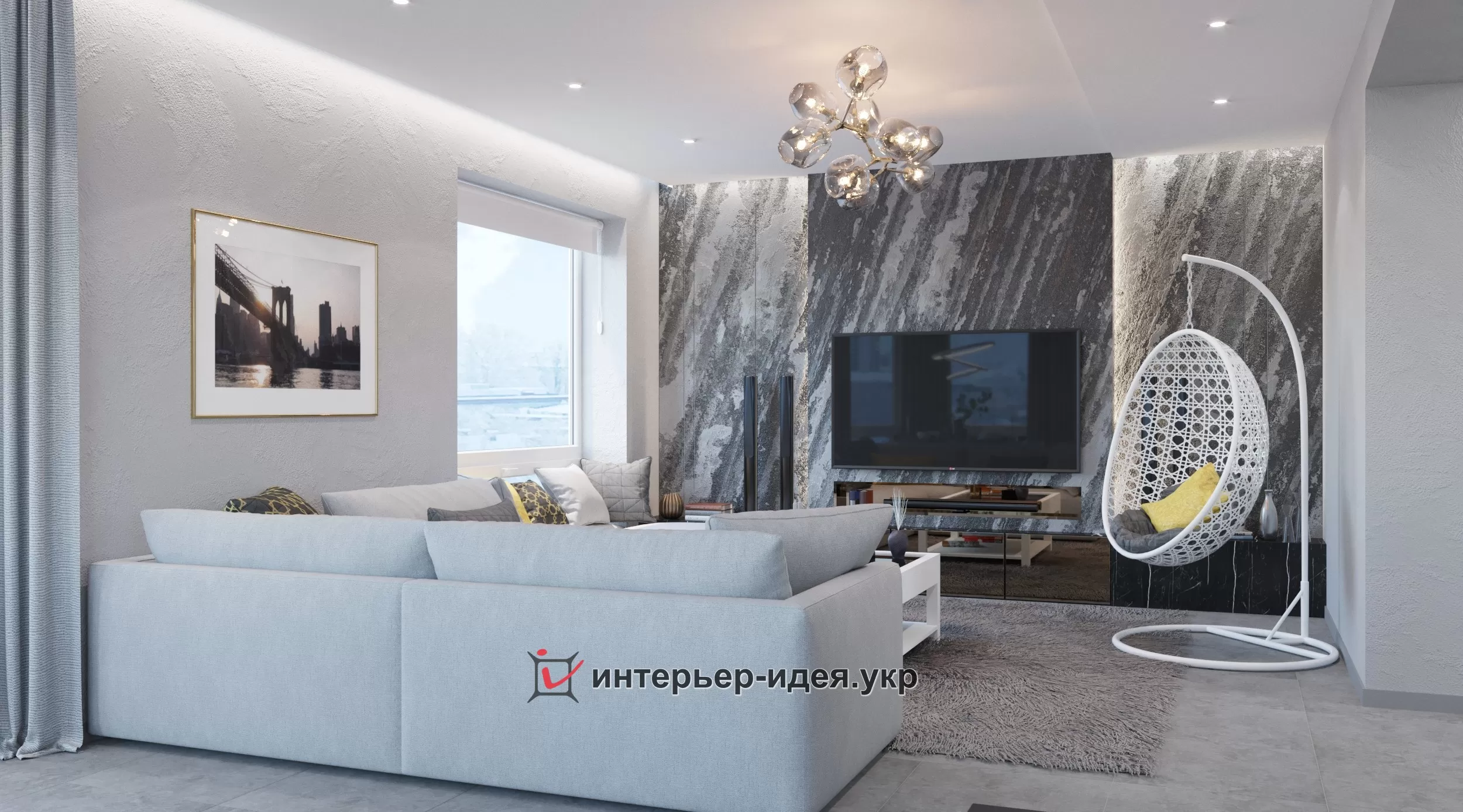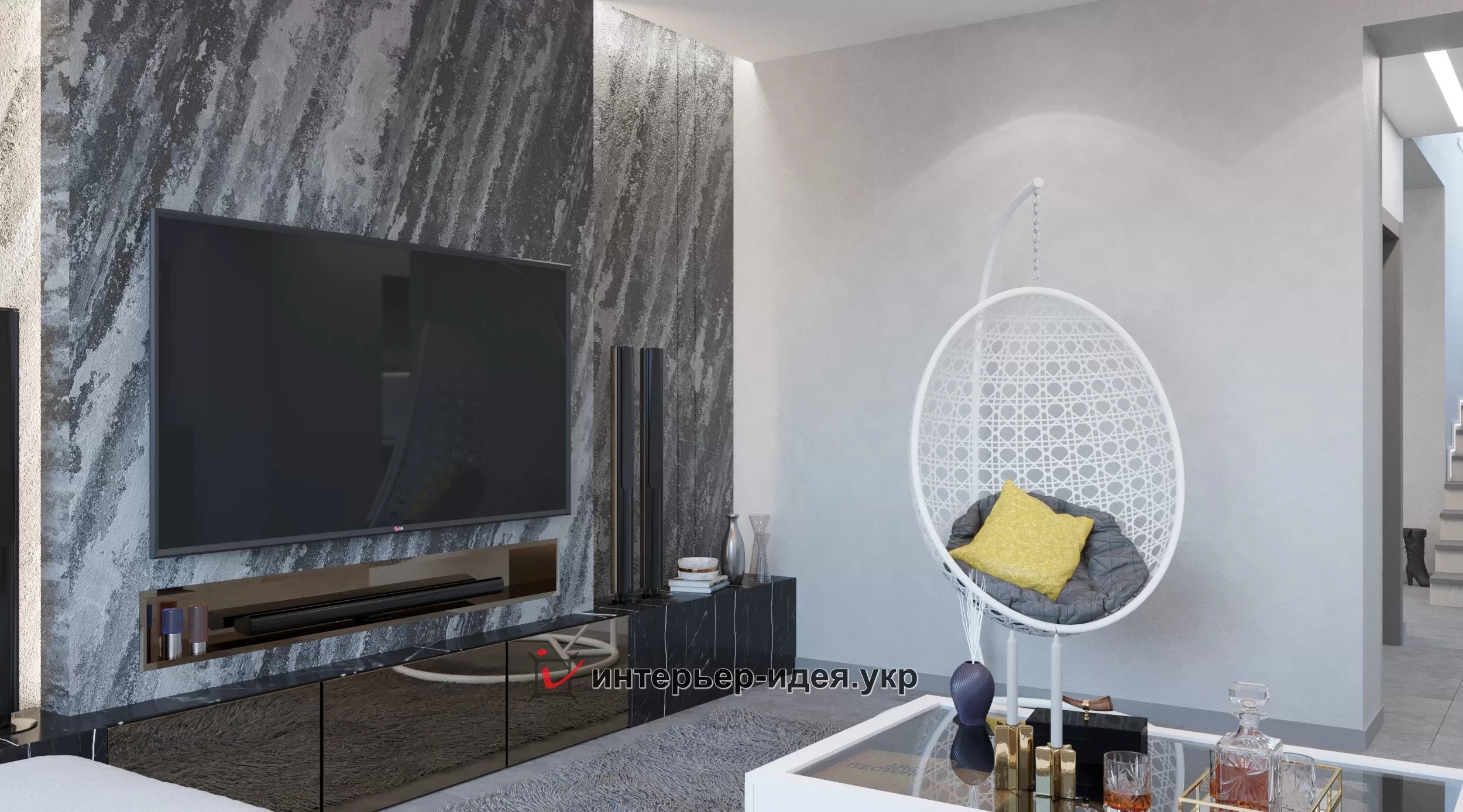 Вітальня - це місце де збирається і відпочиває не тільки сім'я, але і гості, тому був продуманий великий диван і крісло-кокон навпроти величезного 60-дюймового телевізора.