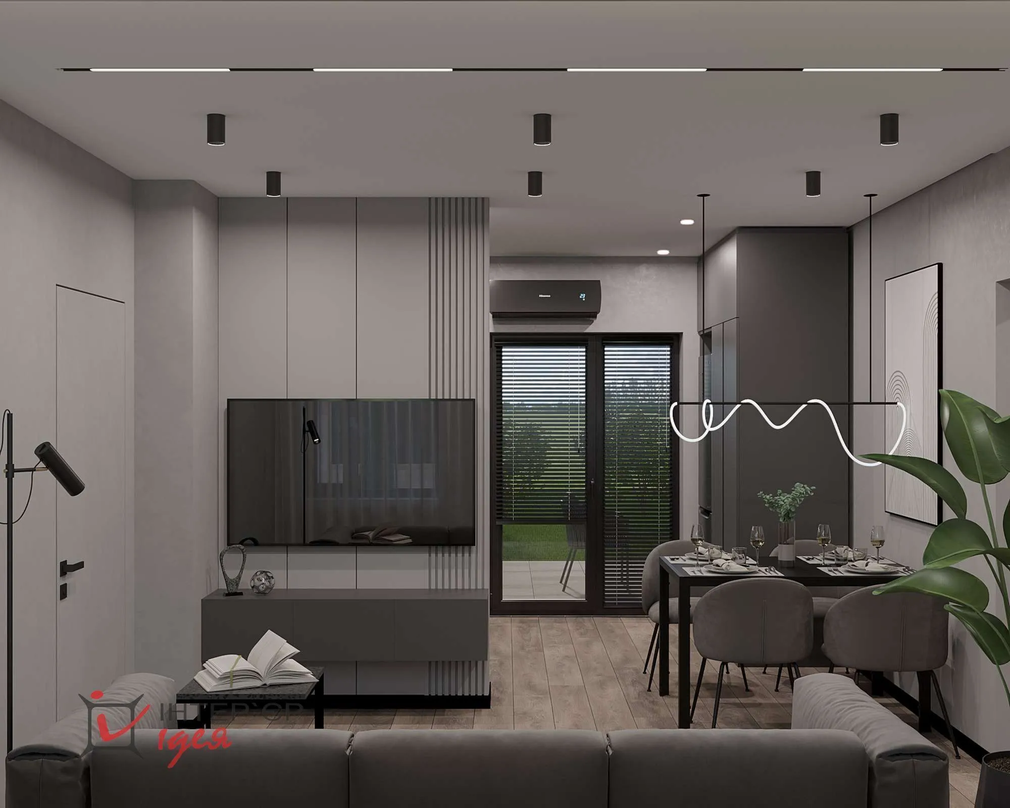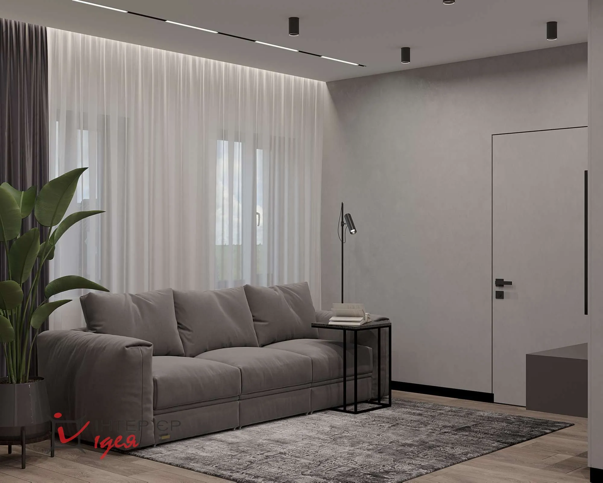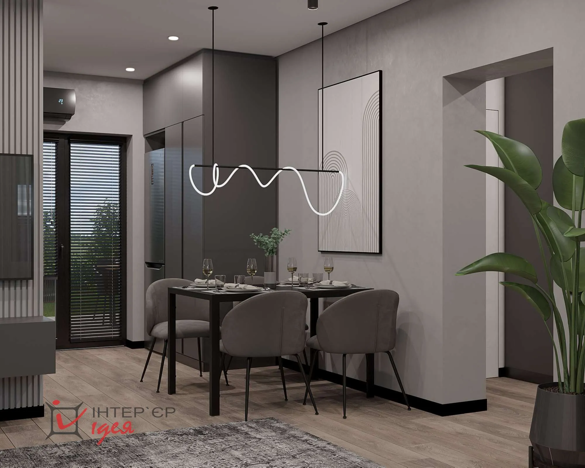 Кухня-вітальня виконана в сучасному стилі, який створює відкритий та затишний простір, де можна об'єднати функціональність кухні та зручність вітальні. Простір кухні розділений на дві частини: робоча поверхня та місце для зберігання з холодильником, що робить таке розташування меблів надзвичайно зручним. У зоні вітальні розташований зручний диван фірми "Frankof".
