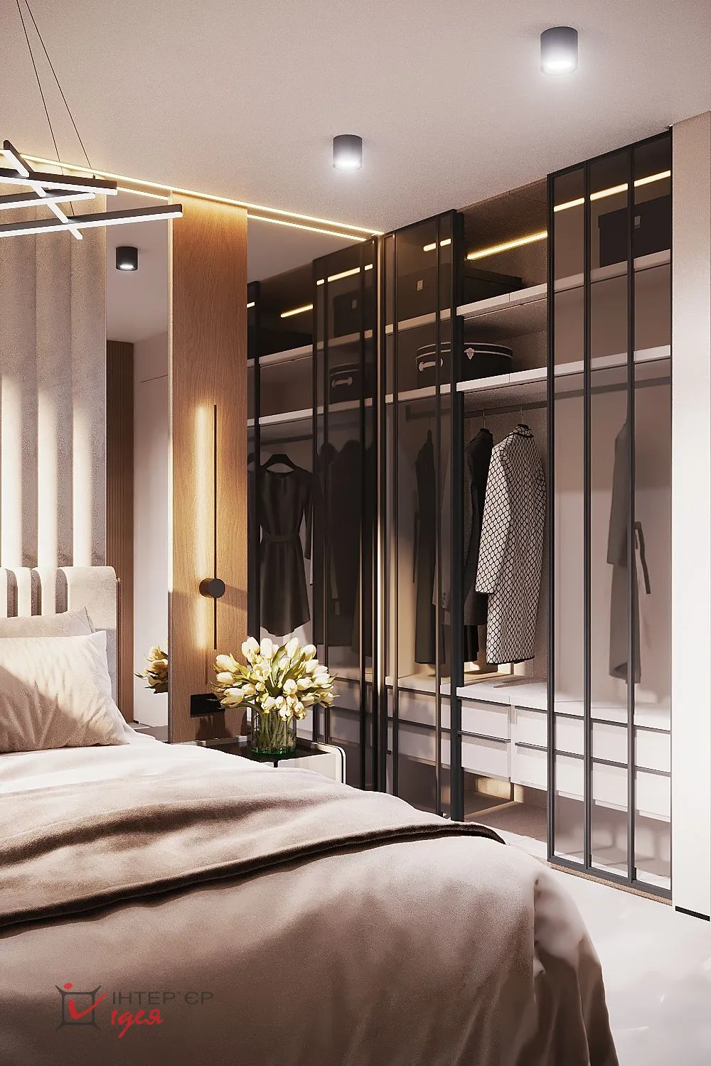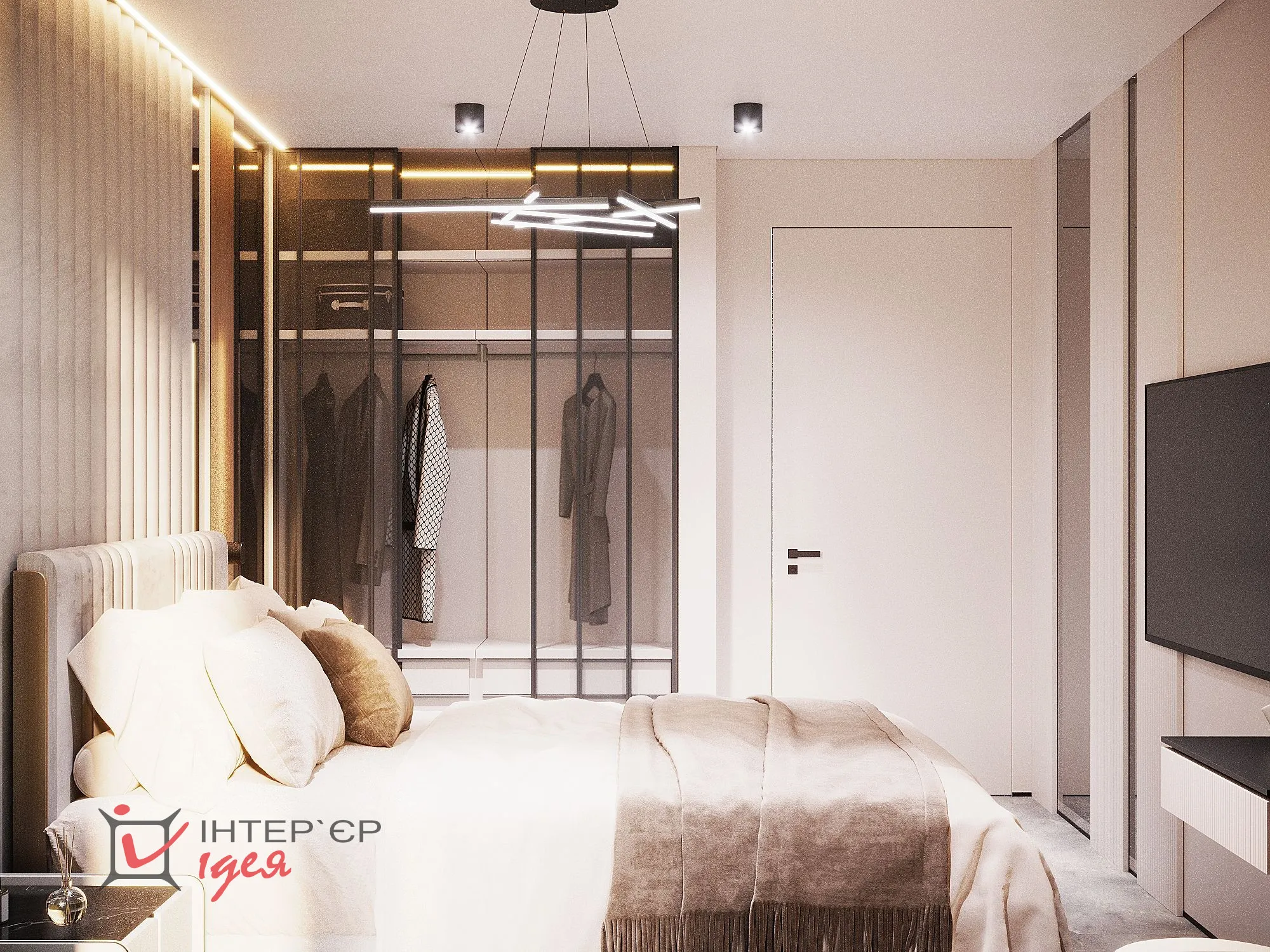 Одним з побажанням замовниці було обов’язково розташувати вбудовану шафу для зберігання одягу. Шафу розроблено та доповнено відкрити полицями з підсвіткою.