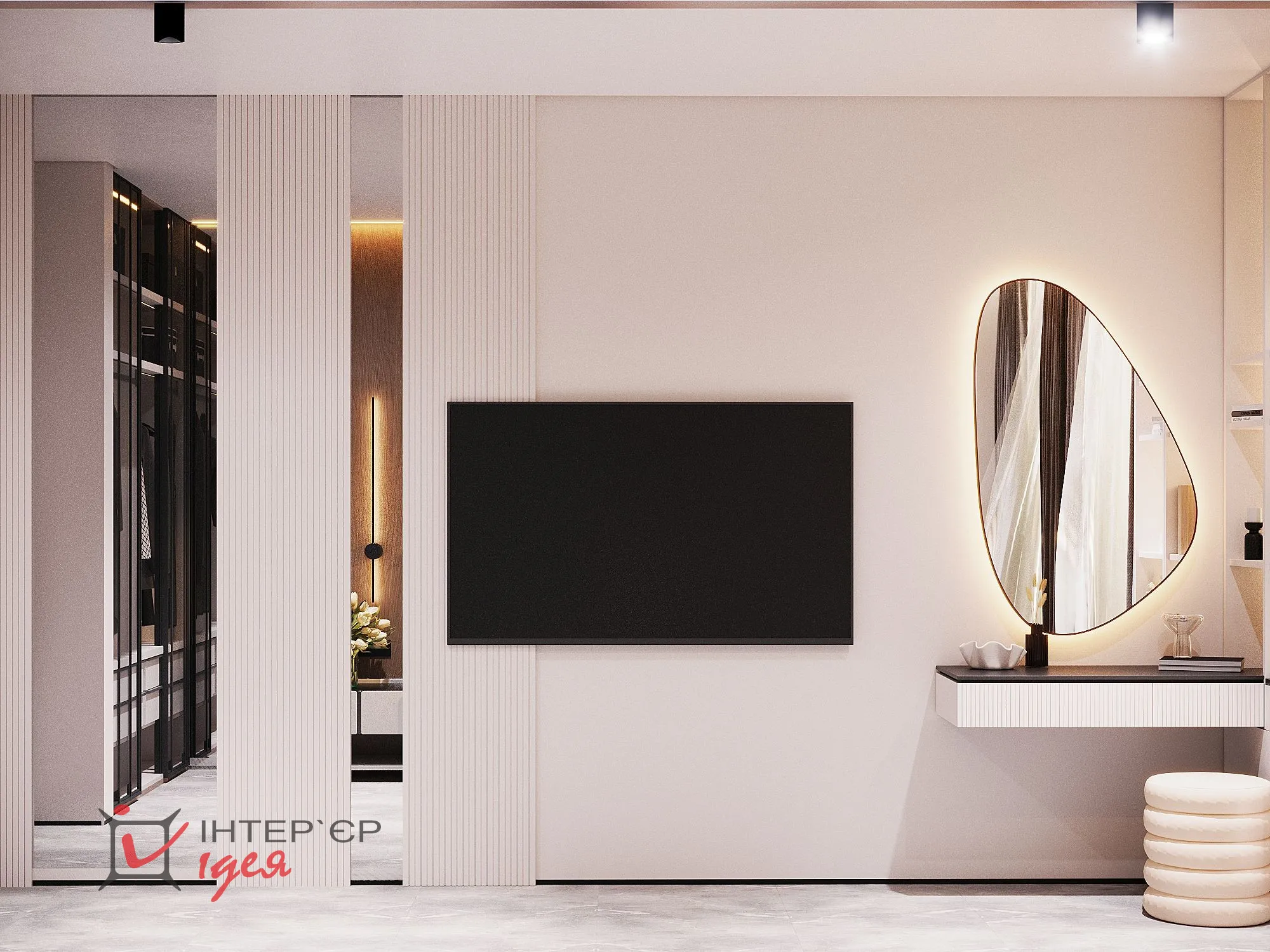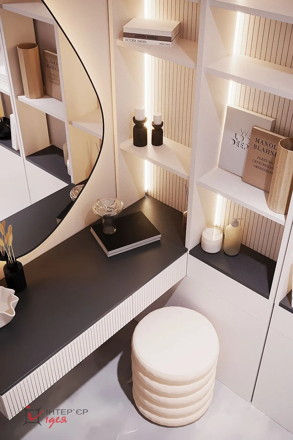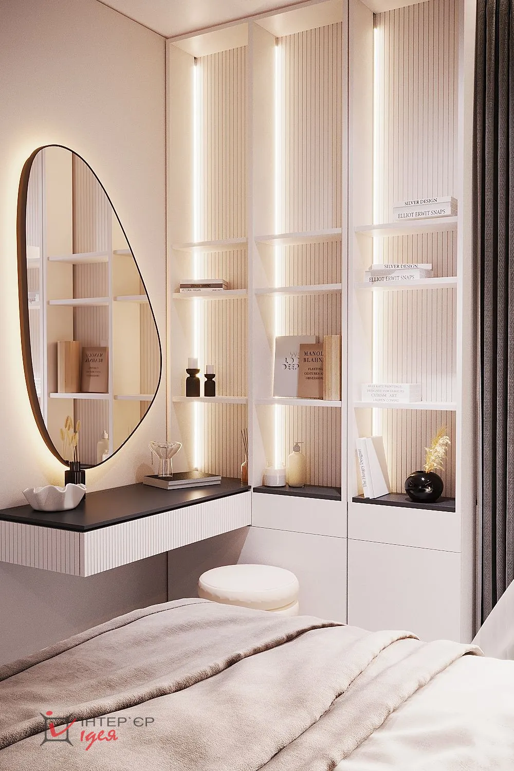 Окремим акцентом виглядає місце туалетного столику з великим фігурним дзеркалом, яке плавно переходить на книжкову шафу з додаванням теплого кольору led-підсвідчування.
