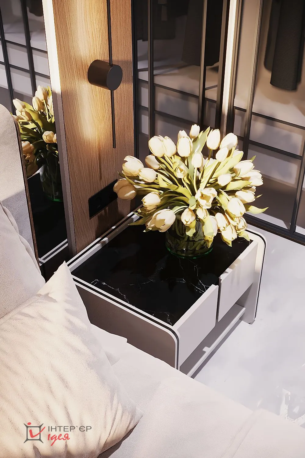 Зручне широке ліжко з мʼяким узголівʼям, з двох боків обладнане приліжковими тумбами з витонченими мінімастими бра чорного кольору.