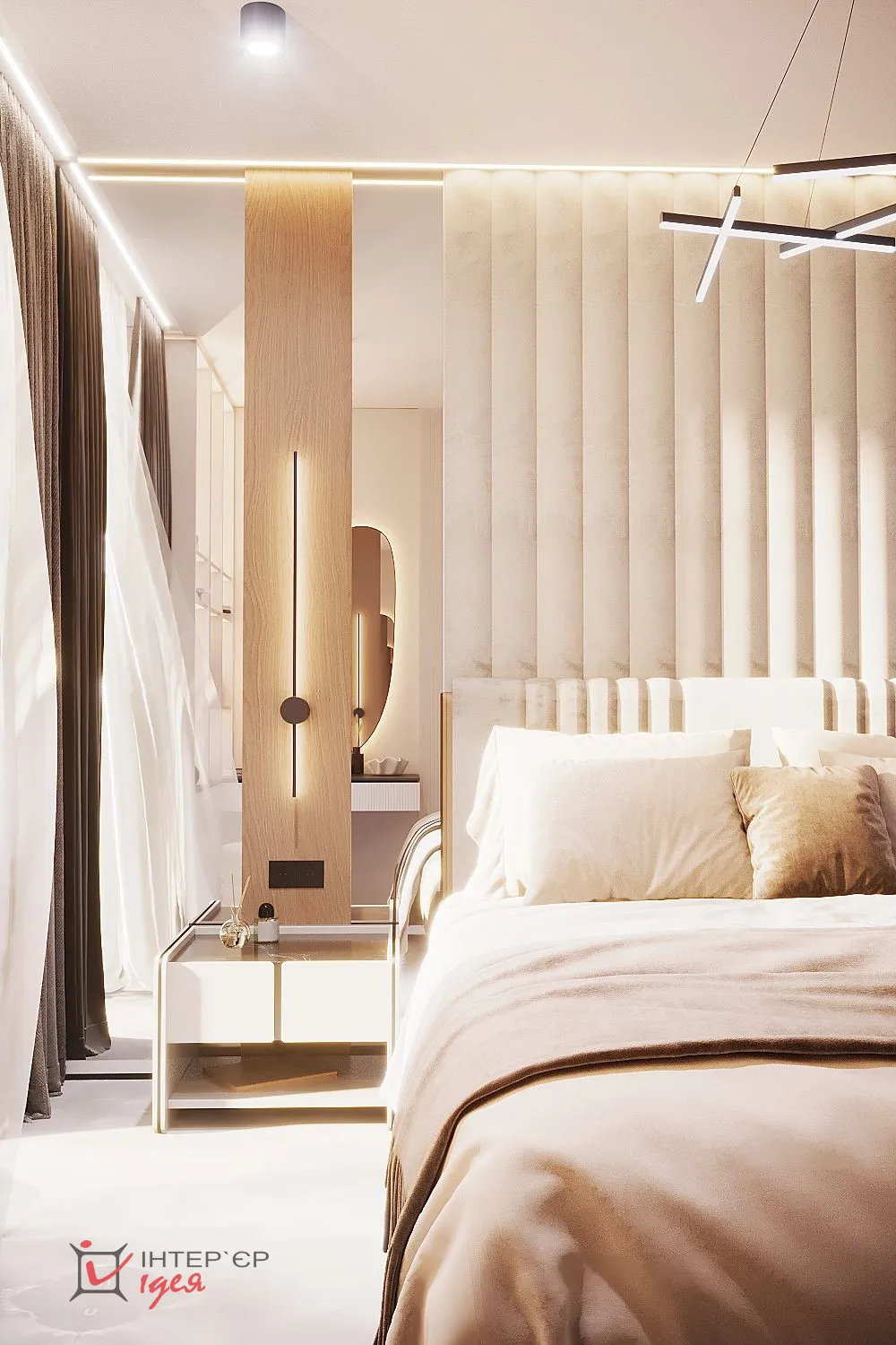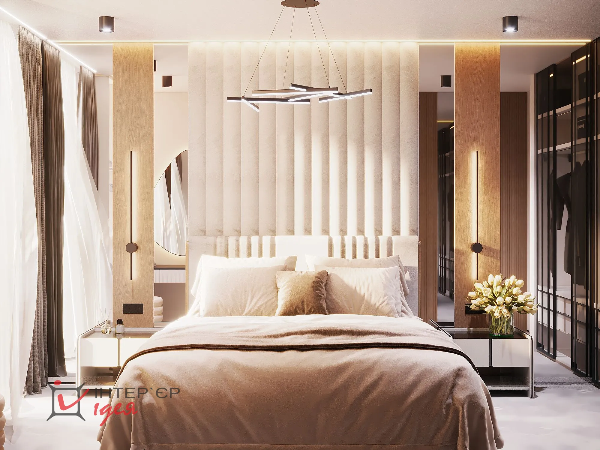 Дизайн спальної кімнати виконаний у світлих відтінках бежового кольору з використанням м’ягких панелей в зоні ліжка, дерева з додаванням тонованого дзеркала. Простір став більш елегантним, витонченішим, вражає своєю легкістю.