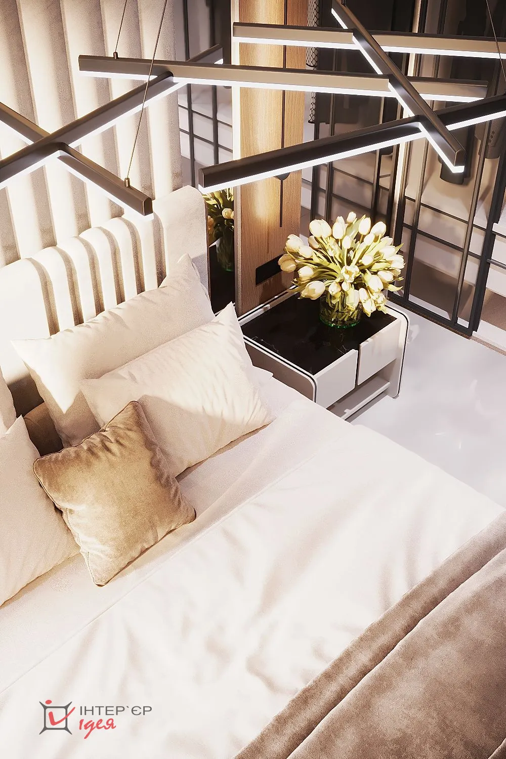 Спальня кімната вийшла досить елегантна, мінімалістична, без зайвих деталей! Простір наповнений красою дозволить відпочити душею й тілом.
