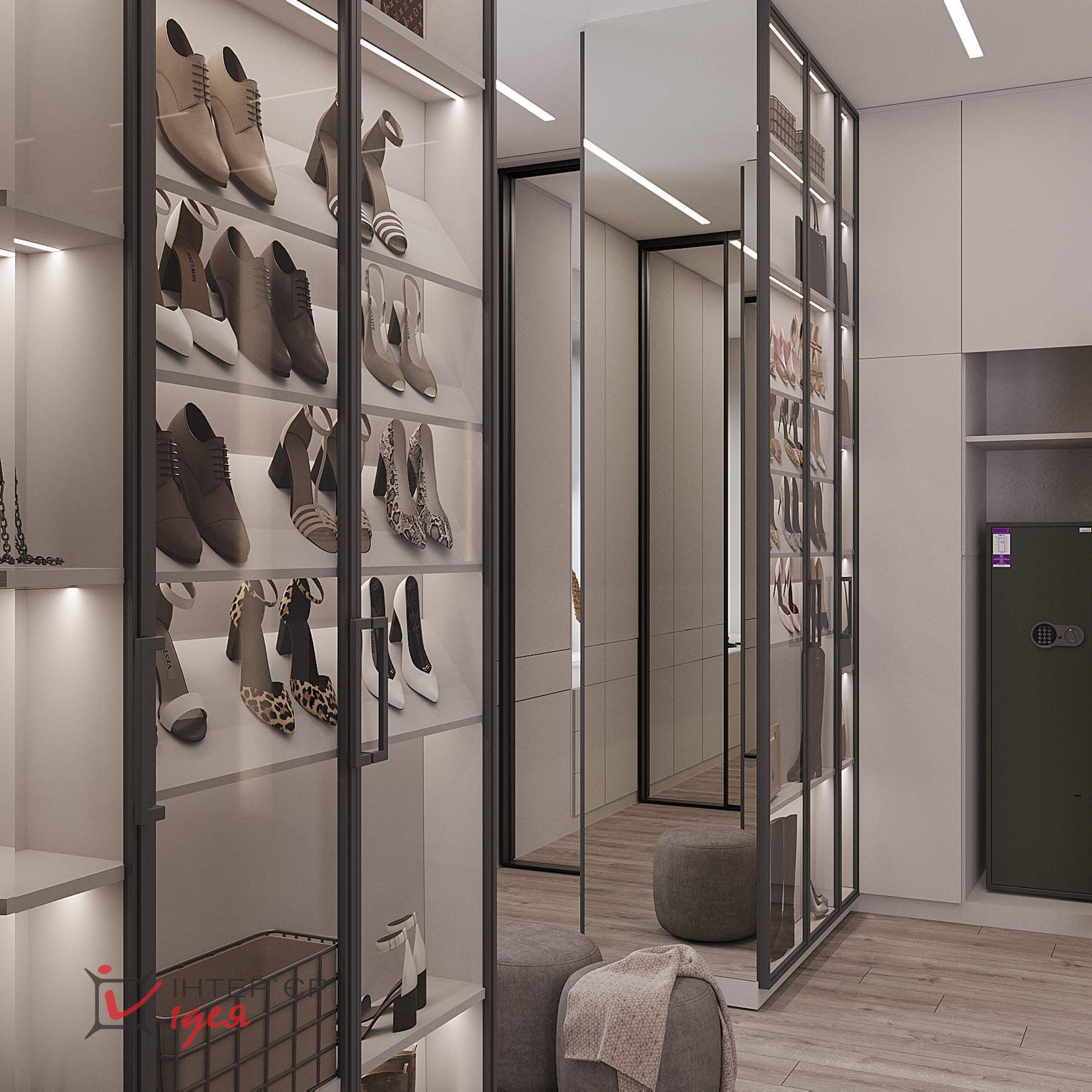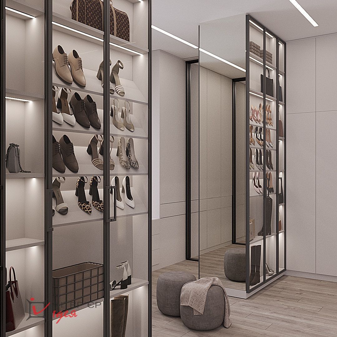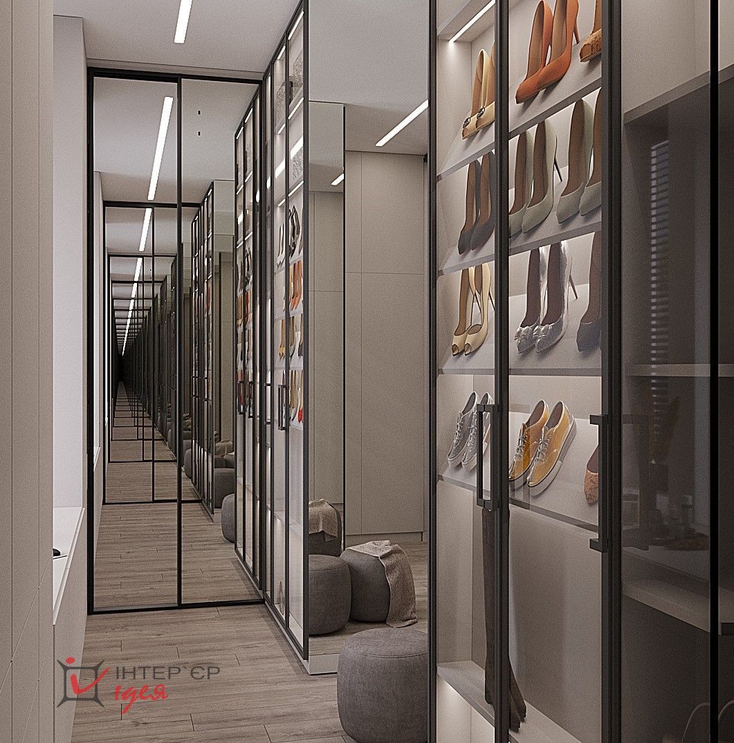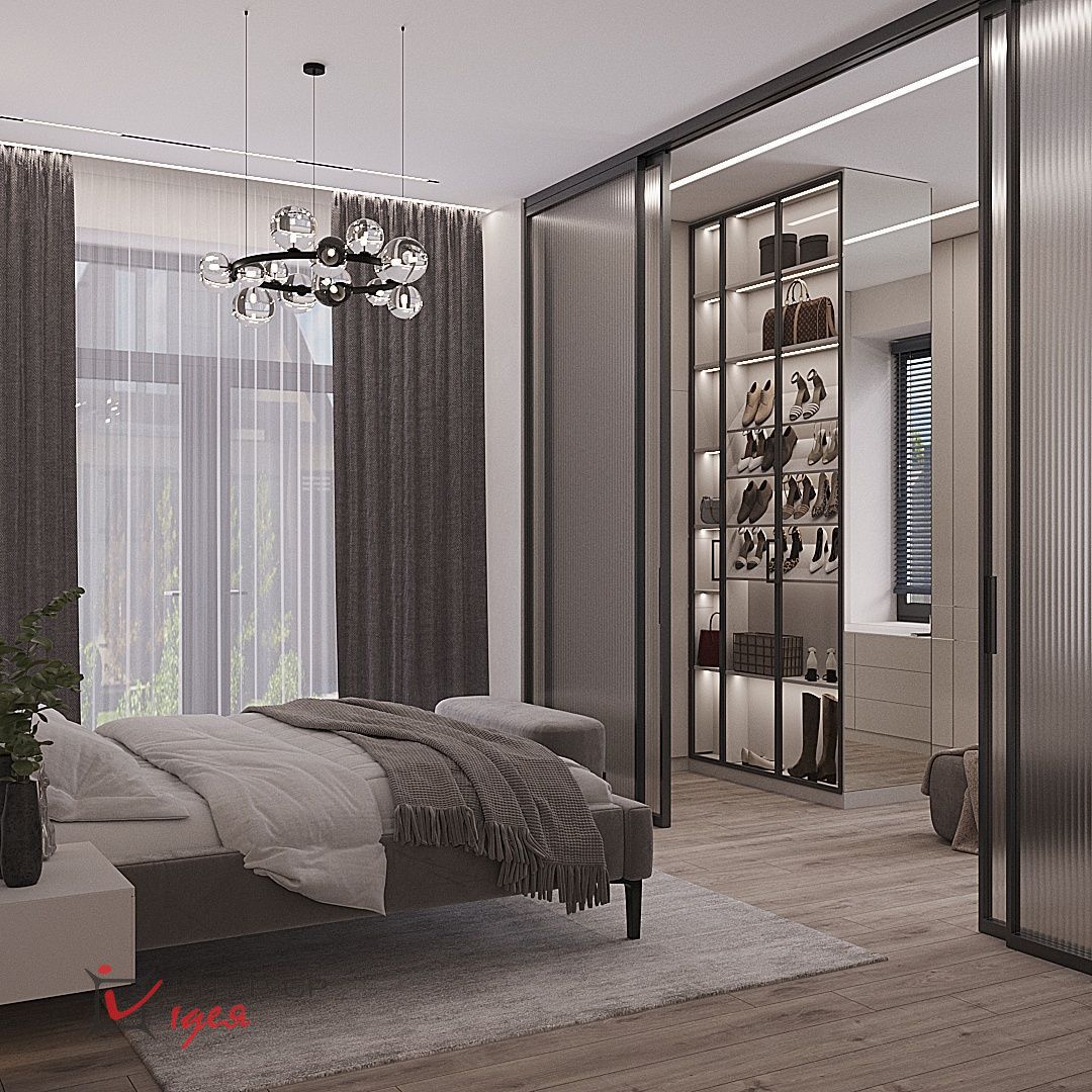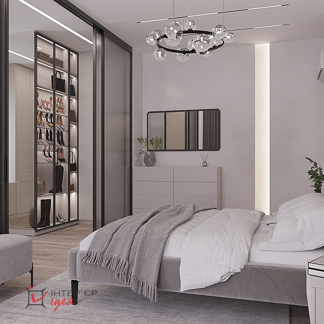 Спальня виконана у світлих тонах. Стіни оздобленні підсвіткою, що робить кімнату більш затишною. В кімнаті немає нічого зайвого, тільки ліжко, прикроватні тумби, банкетка та комод, що візуально робить простір легшим. Спальня та гардеробна розділена розсувною перегородкою з рифленим склом. В гардеробній розміщено багато місць для зберігання, особливо для взуття. Також розміщено багато дзеркал, що збільшує простір та можливість замовниці насолоджуватися своїм відображенням. Всі полиці оздоблені підсвітками для зручності користування гардеробною.