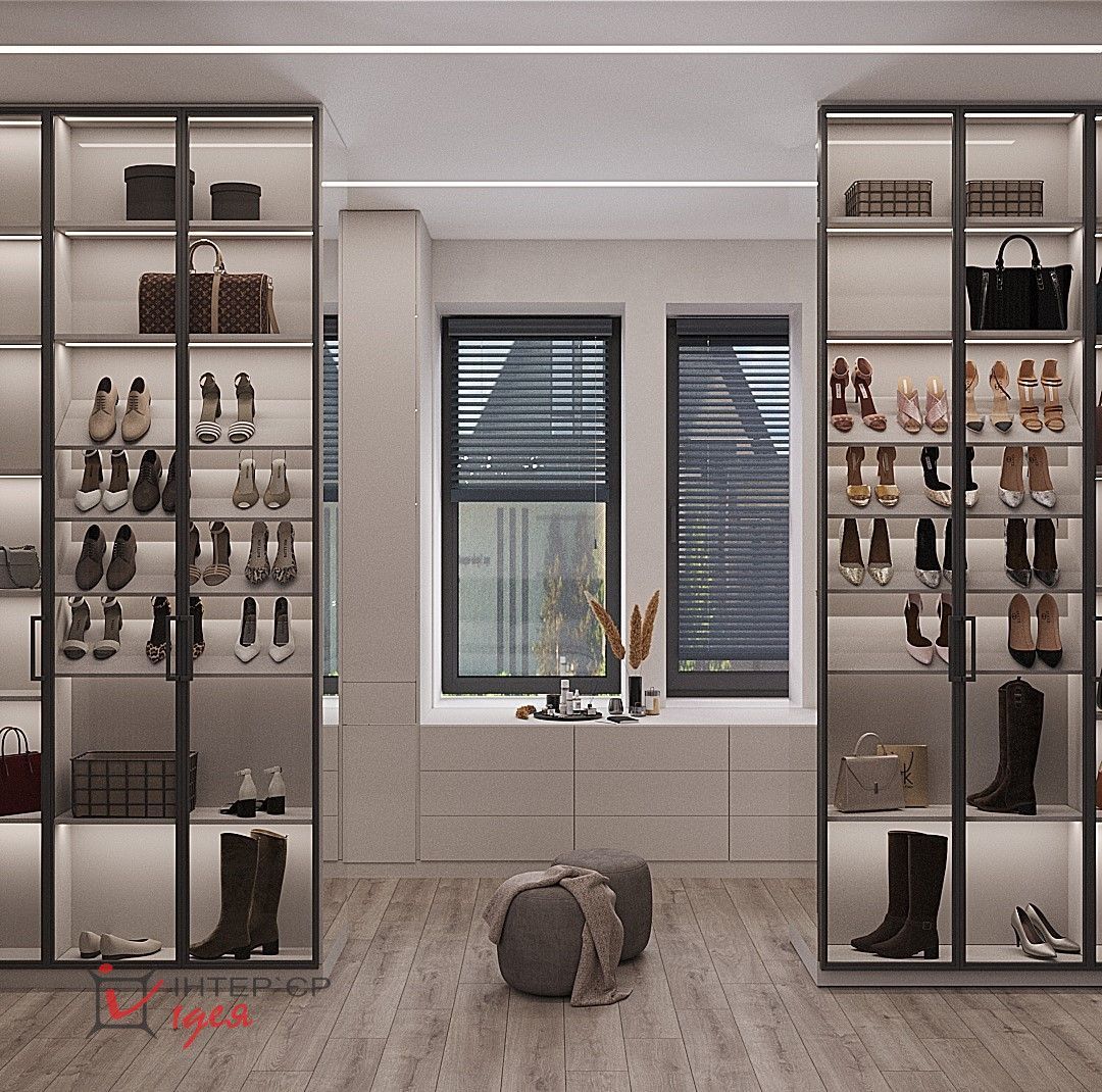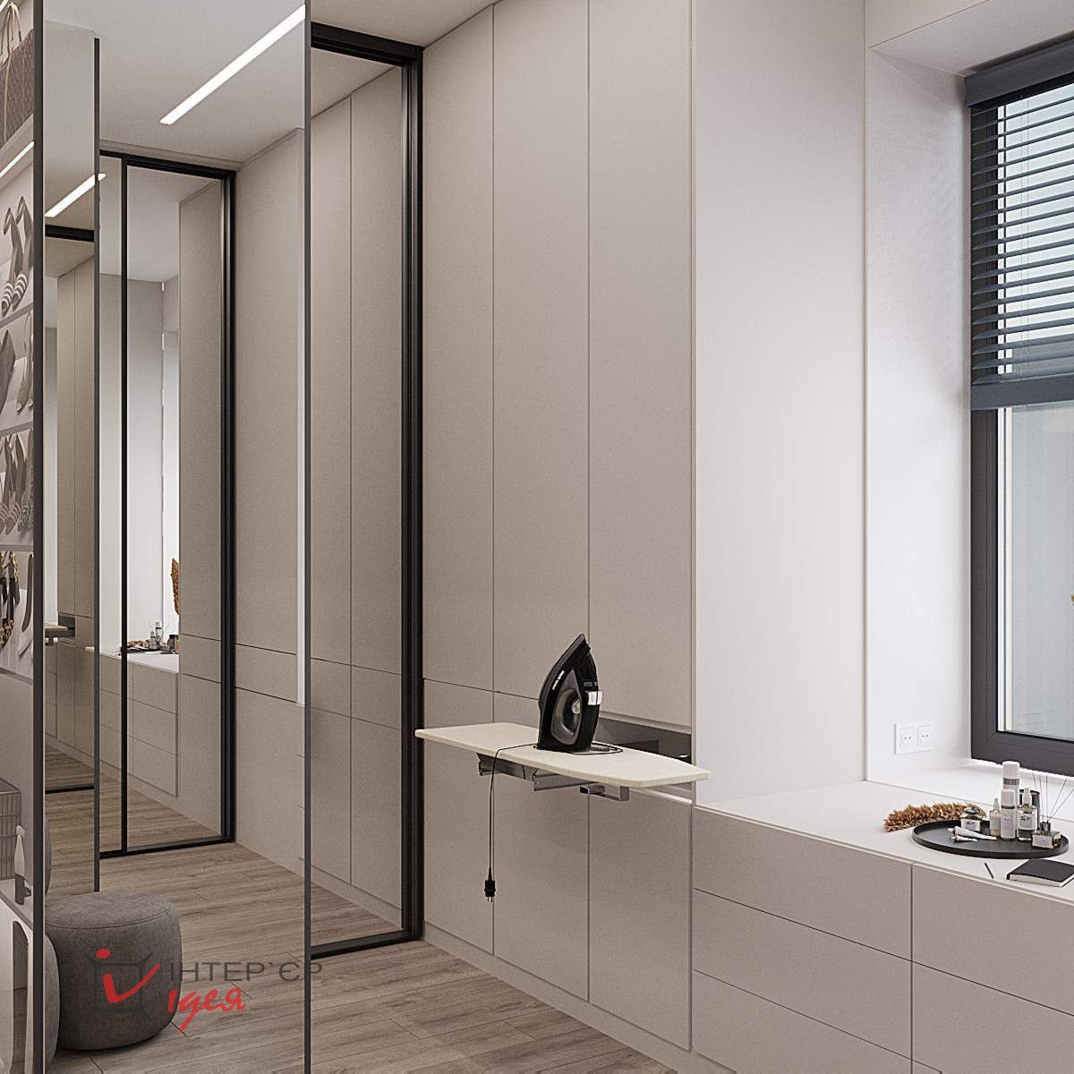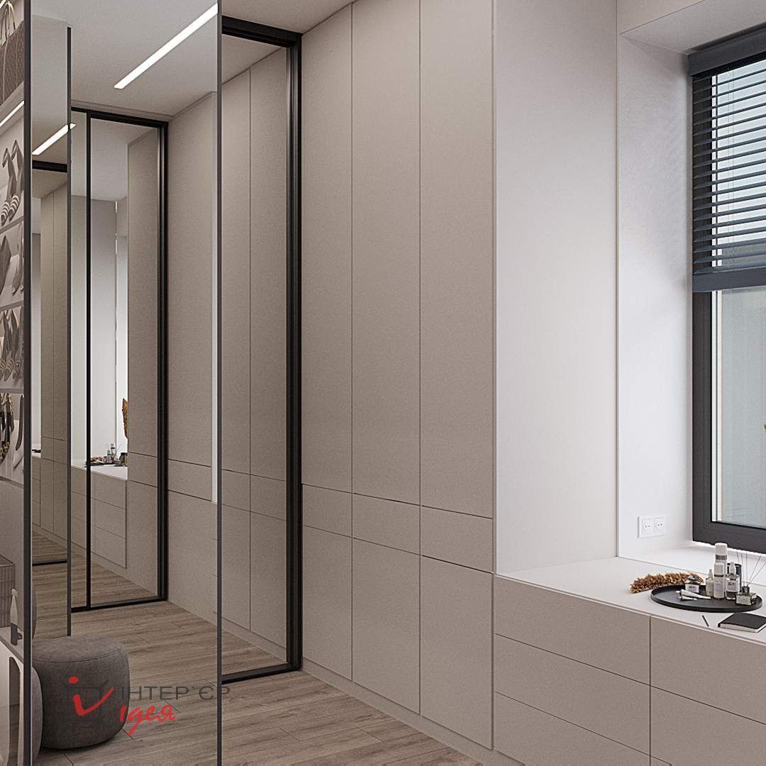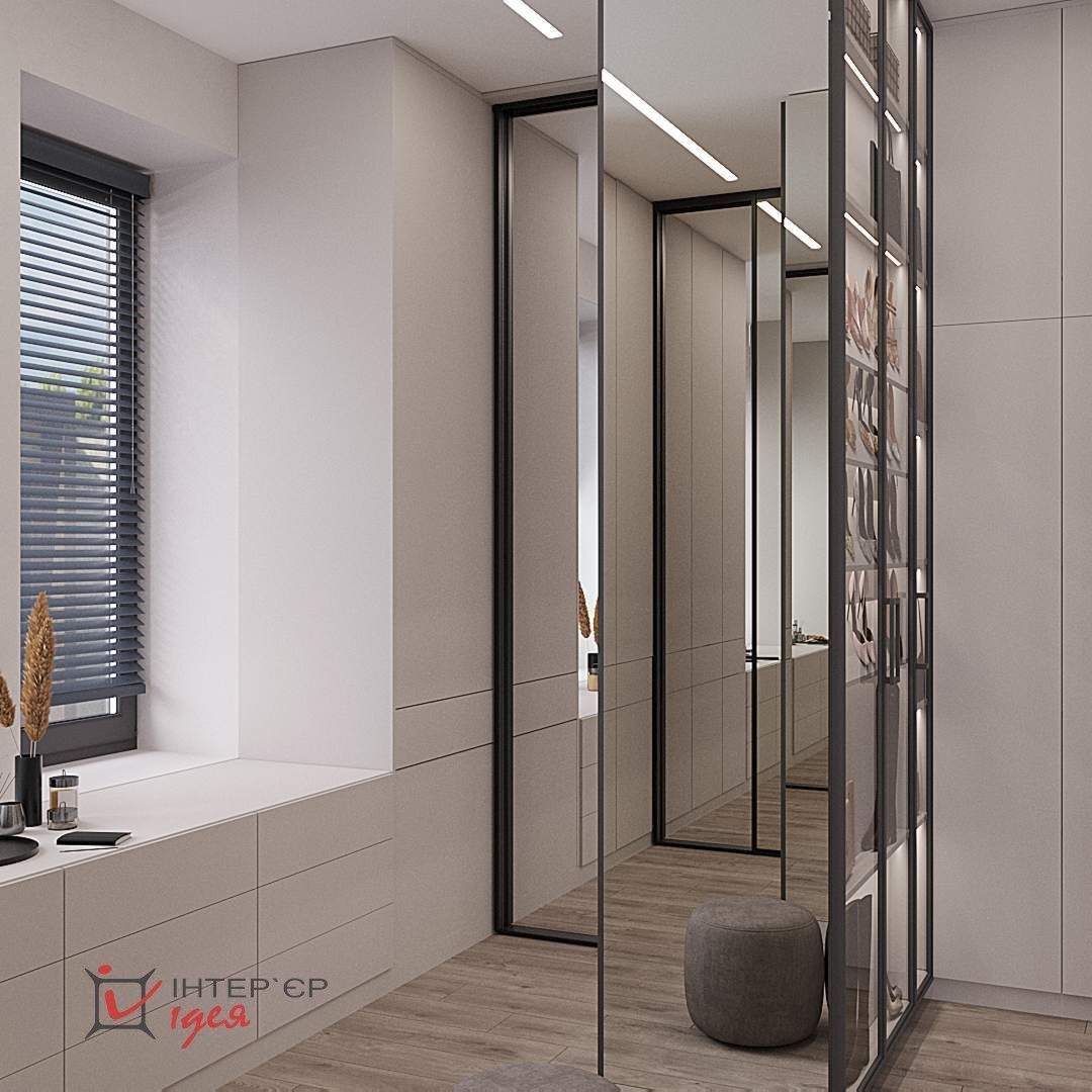 Спальня виконана у світлих тонах. Стіни оздобленні підсвіткою, що робить кімнату більш затишною. В кімнаті немає нічого зайвого, тільки ліжко, прикроватні тумби, банкетка та комод, що візуально робить простір легшим. Спальня та гардеробна розділена розсувною перегородкою з рифленим склом. В гардеробній розміщено багато місць для зберігання, особливо для взуття. Також розміщено багато дзеркал, що збільшує простір та можливість замовниці насолоджуватися своїм відображенням. Всі полиці оздоблені підсвітками для зручності користування гардеробною.